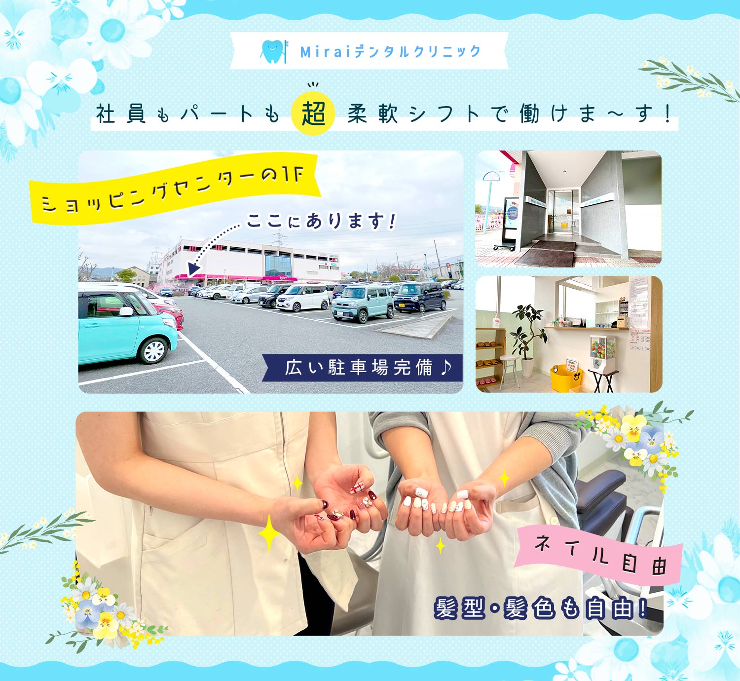 | 待 遇 | #昇給あり #社会保険完備 交通費支給 (全額) #車通勤OK (広い駐車場完備) バイク・自転車通勤OK 制服・靴貸与 残業手当 ネイルOK 髪型・髪色自由 |