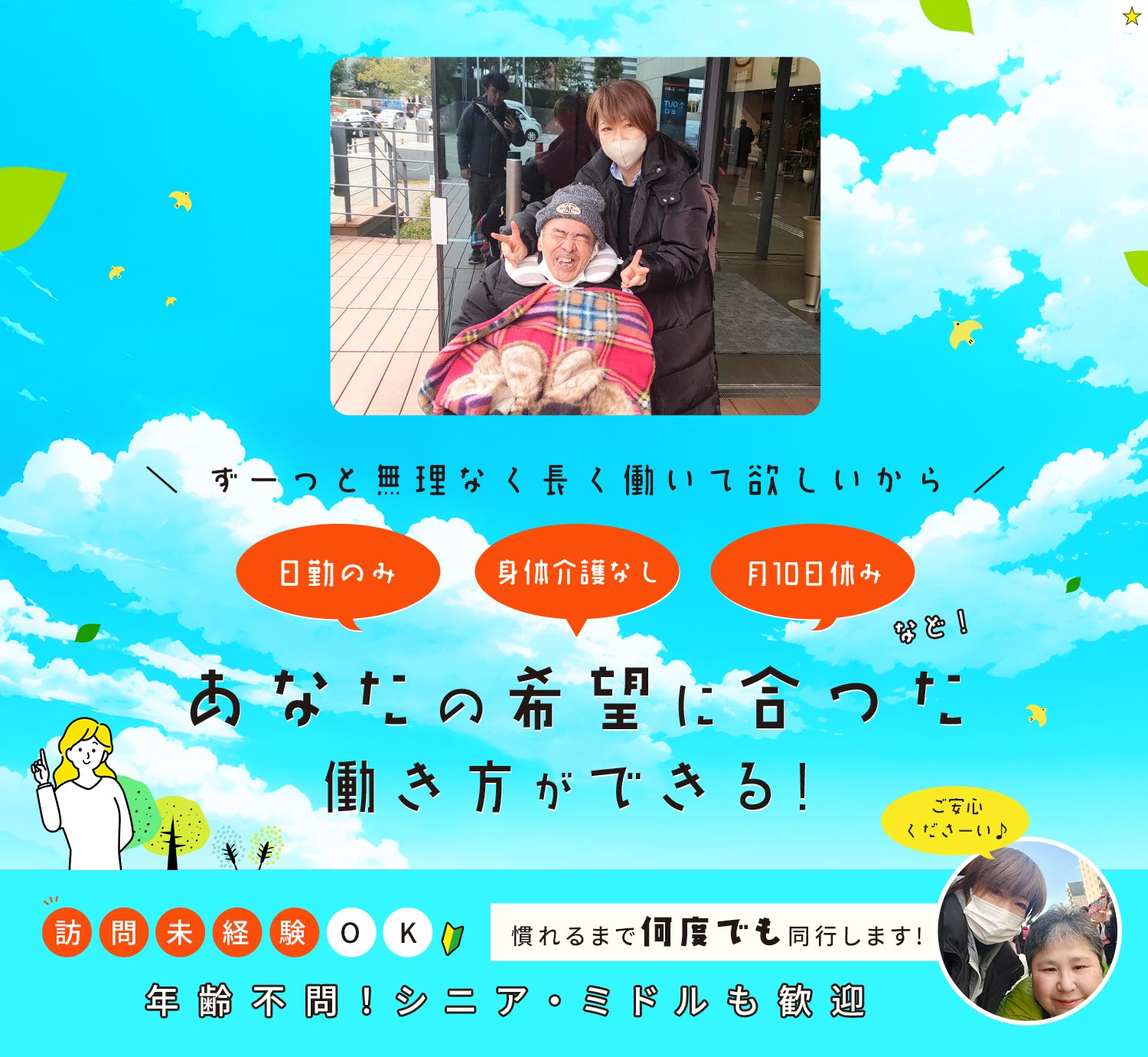 応募資格 | 介護職員初任者研修修了(旧ヘルパー2級)以上 #ブランクOK ※訪問介護未経験OK ※年齢不問!シニアやミドルも歓迎(70代活躍中) |