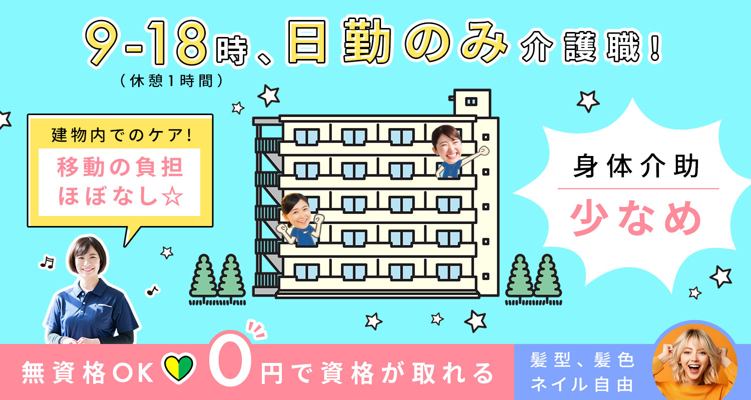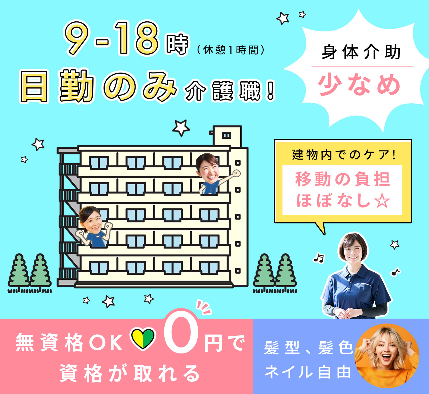 職 種 | (1)日勤のみ介護福祉士 (2)日勤のみ介護職(無資格もOK) |