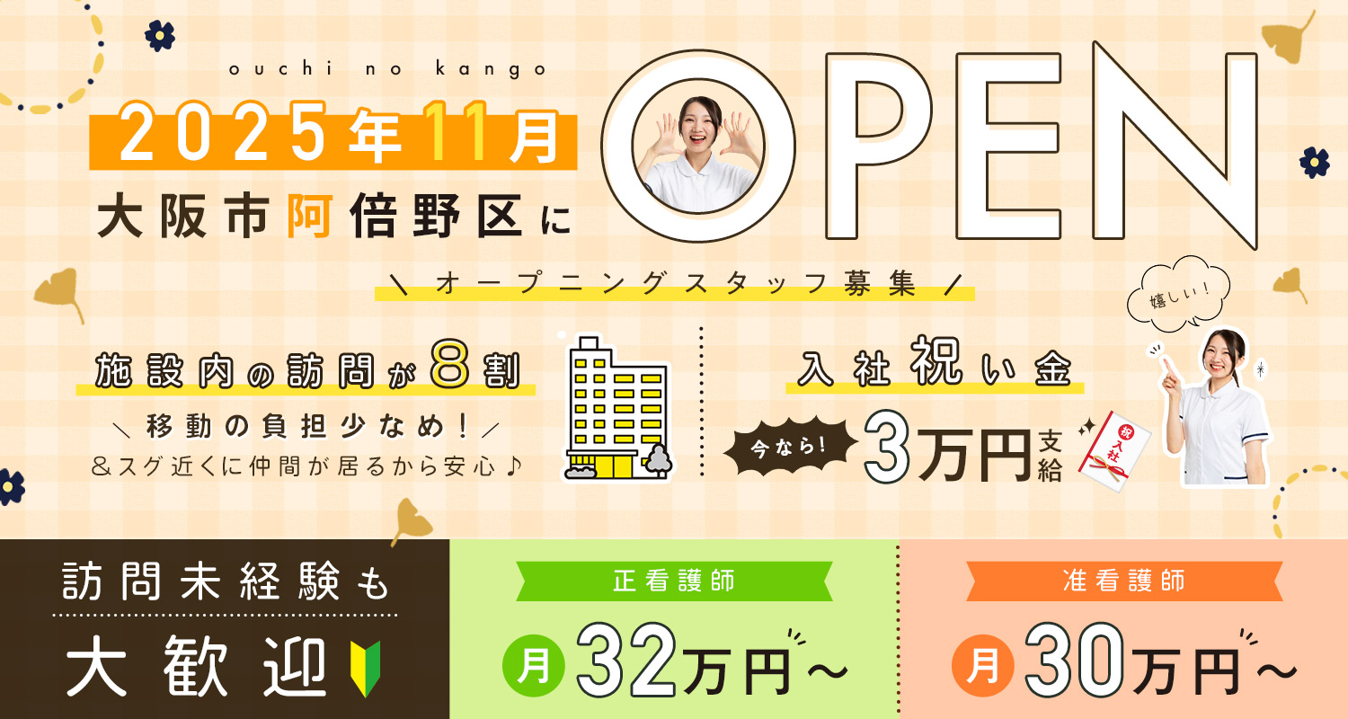 仕事内容 | 訪問看護師/オープニング[社] 医師やケアマネとの連携を図りながら、医師の指示に基づく処置、病状観察、在宅でのリハビリケアなどをお願いします。 ※訪問エリア…大阪市阿倍野区中心 ※訪問先…全体の約8割が介護施設(グループホーム)、約2割が居宅 ※移動手段…社用車・電動自転車(貸与あり) ★直行・直帰OK! |