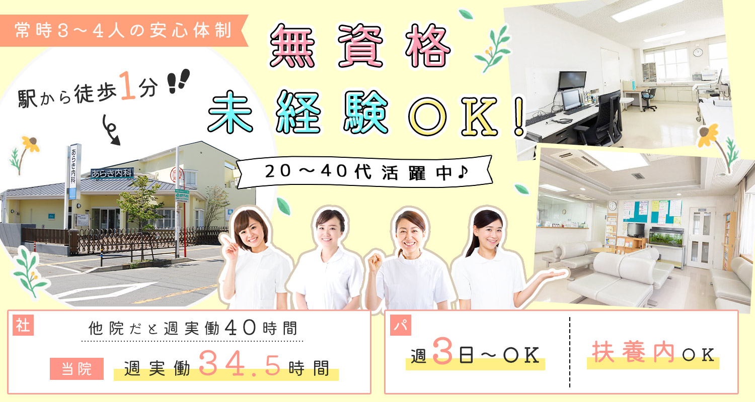 | 休日・休暇 | シフト制/週3日から勤務OK! ※平日のみ勤務もOK! <休診>日曜、祝日、水曜午後、土曜午後 <休暇>お盆、年末年始、有給休暇 |