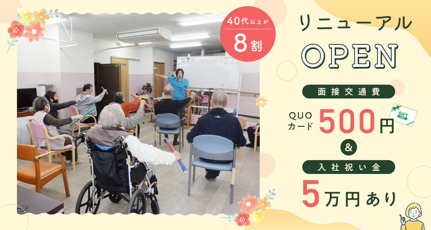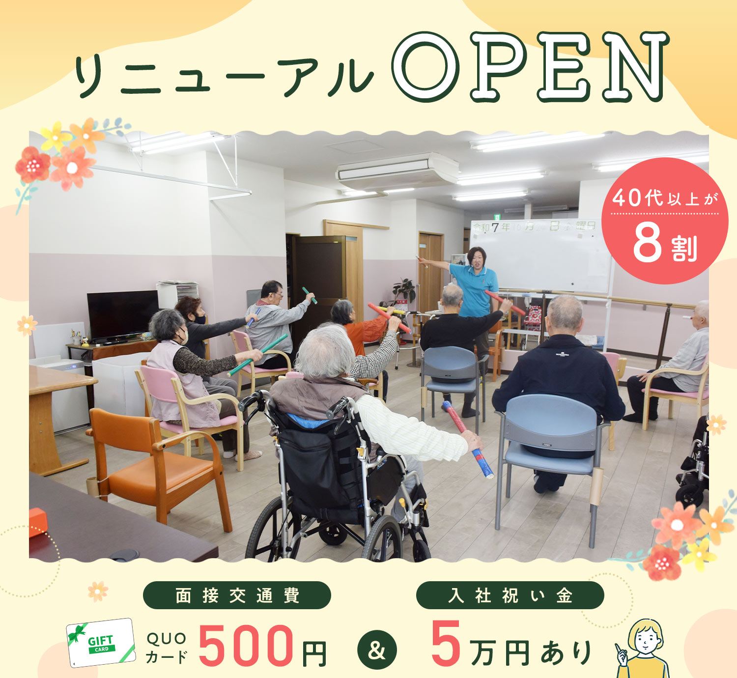 | 仕事内容 | デイサービスの介護福祉士[社] 今年移転リニューアルオープンの綺麗な小規模デイサービス(定員18名)。 利用者様の身の回りのサポート(入浴や食事など)、レクリエーションの企画・実施、健康チェック、リハビリ補助などの介護業務をお願いします。 ※元気な利用者様が中心 利用者様の目標や思いをどうすれば達成させてあげられるか、一人ひとりに寄り添うリハビリや介助・サポートを提供しています。 ※1日あたりスタッフ約5〜6名のゆとりある体制! ※慣れてきたら送迎もお願いします。 朝と夕方に利用者様2名程の送迎。基本、片道15分以内なので運転の負担も少なめです! |