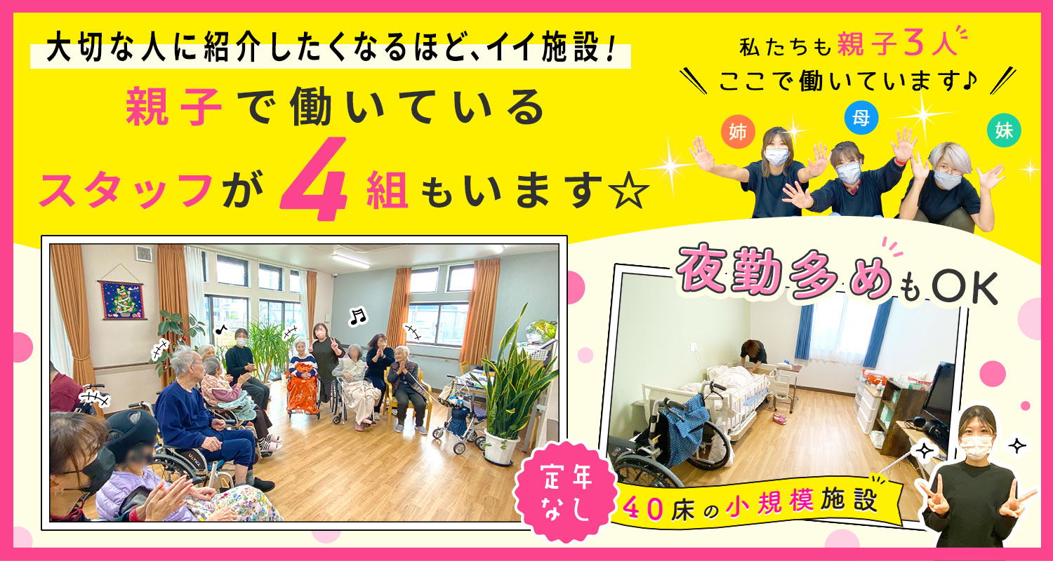| 仕事内容 | (1)介護職/介護職員[社] (2)介護福祉士・介護[社] 40床の小規模施設(サービス付き高齢者向け住宅)にて、 入居者様の生活のサポート(食事・口腔ケア・入浴・身体介助など)をお願いします。 ※身体介護と生活支援の割合は、おおよそ6:4 ※介護記録はタブレットで入力 紙の記録に比べてスピーディーでかんたん!慣れていない方もスグに使いこなせますよ。 入居者様のケア中に分からないこと・不安なことがあれば、いつでも連絡や声掛けができる体制! 施設内には仲間がたくさんいるので、遠慮なく頼ってくださいね。 |