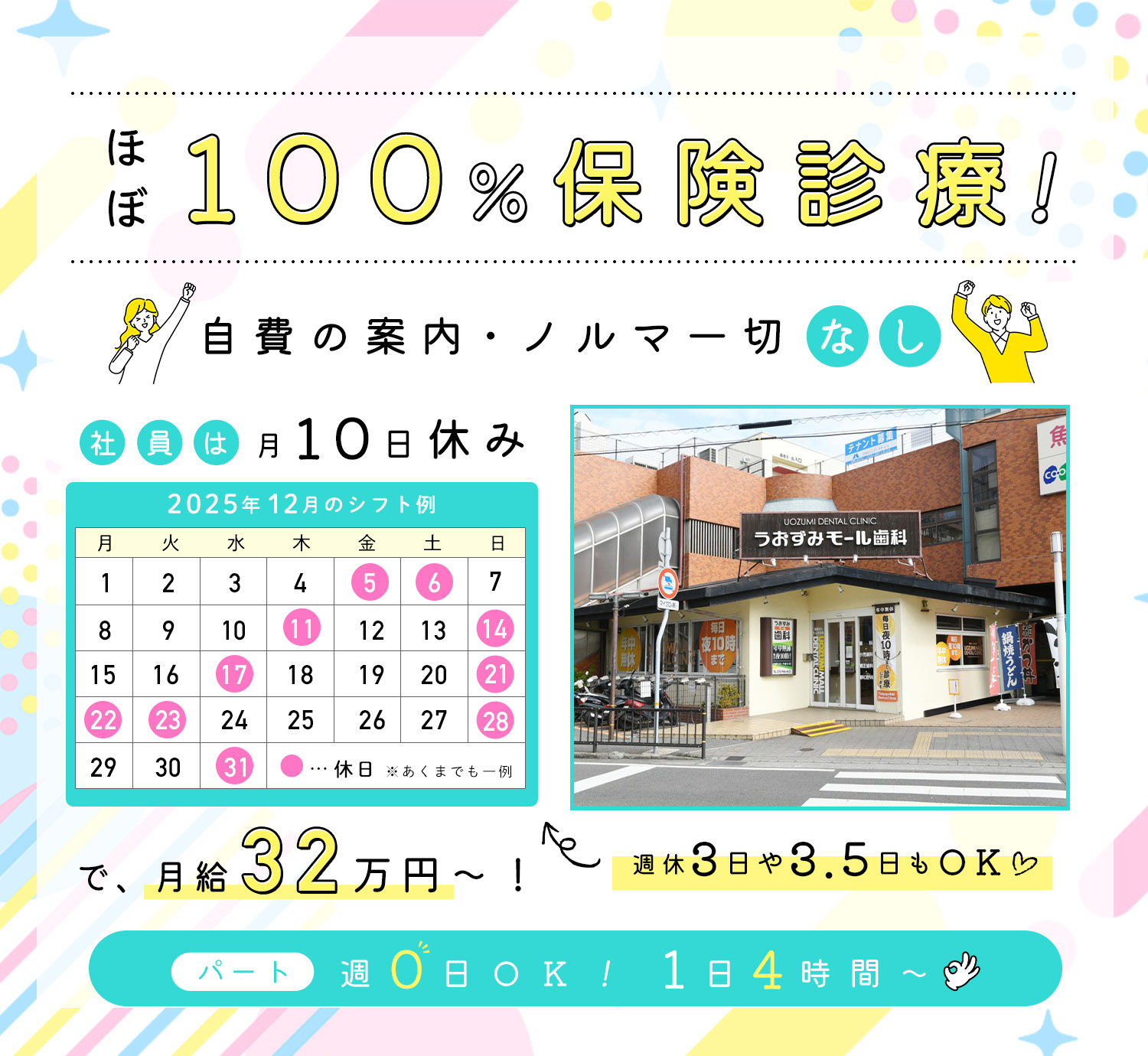 | 応募資格 | 歯科衛生士資格 #ブランクOK、実務未経験OK ※年齢不問(シニアやミドルも歓迎) ※今春新卒(専門・短大・大学)、第二新卒歓迎 |