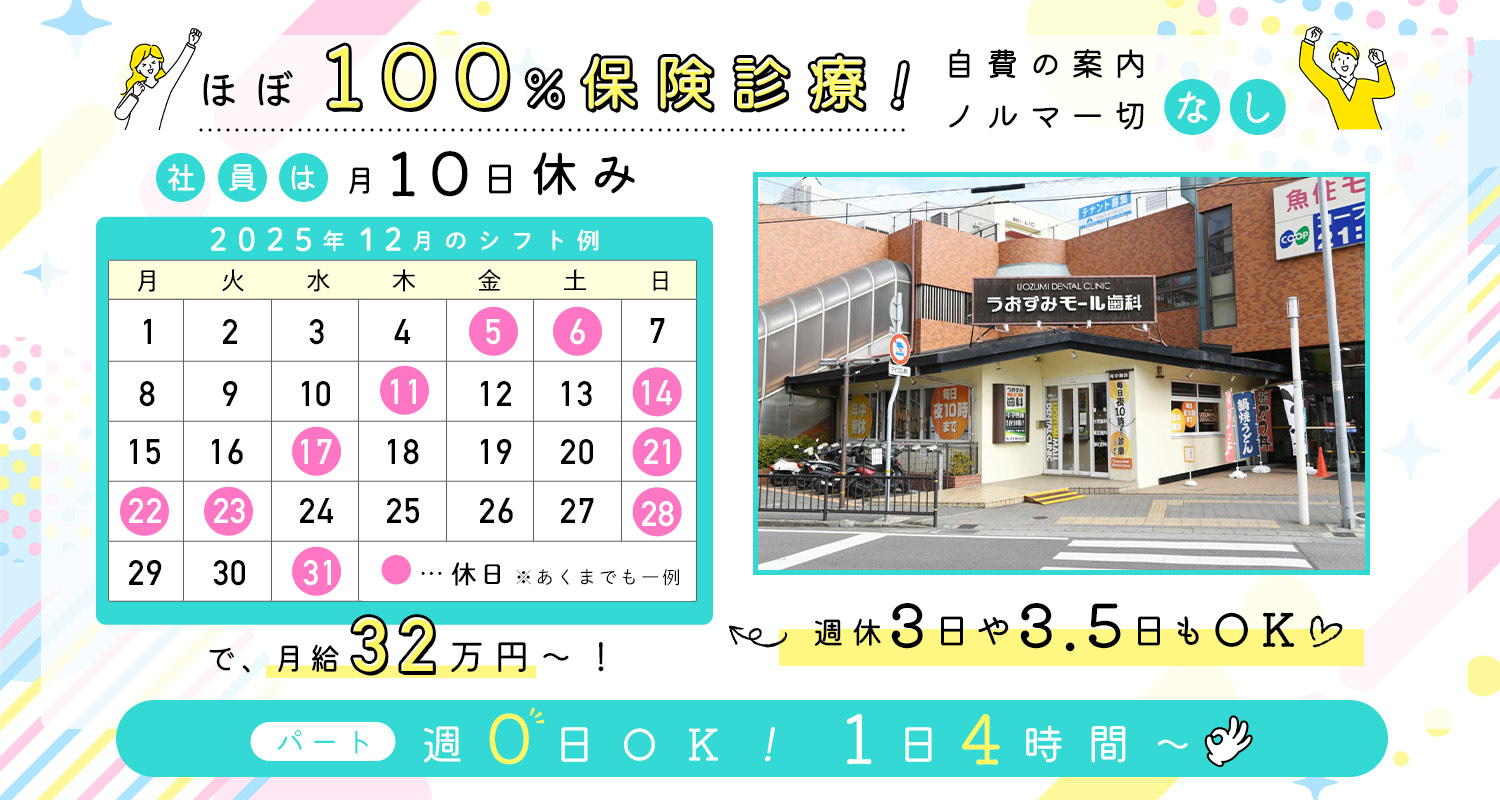 | 勤務地 | 兵庫県明石市魚住町錦が丘4-3-1 魚住モール内1F/うおずみモール歯科 |