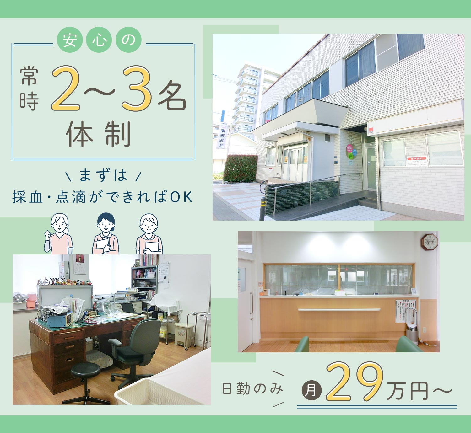 | 仕事内容 | クリニックの看護師[社] 血圧測定、検尿、カルテ作成、注射、点滴、採血、レントゲン撮影の準備、検尿、診察介助、吸入準備、浣腸、心電図、医師のサポートなど看護師業務全般をお願いします。 ※看護師は『常時2~3名』ゆとりの人員体制 一部の時間帯は3名体制をとっています。(月・木・土の午前、火の午後) ★科目未経験の方も歓迎! 子どもさんも多く来院されるため、待合室にはキッズスペースあり。 さらに、予防接種に来た子どもさんが過ごすための個室を設けており、他の患者様から風邪がうつったりする心配もなく安心です。 子どもさんの採血をすることはありません。 |