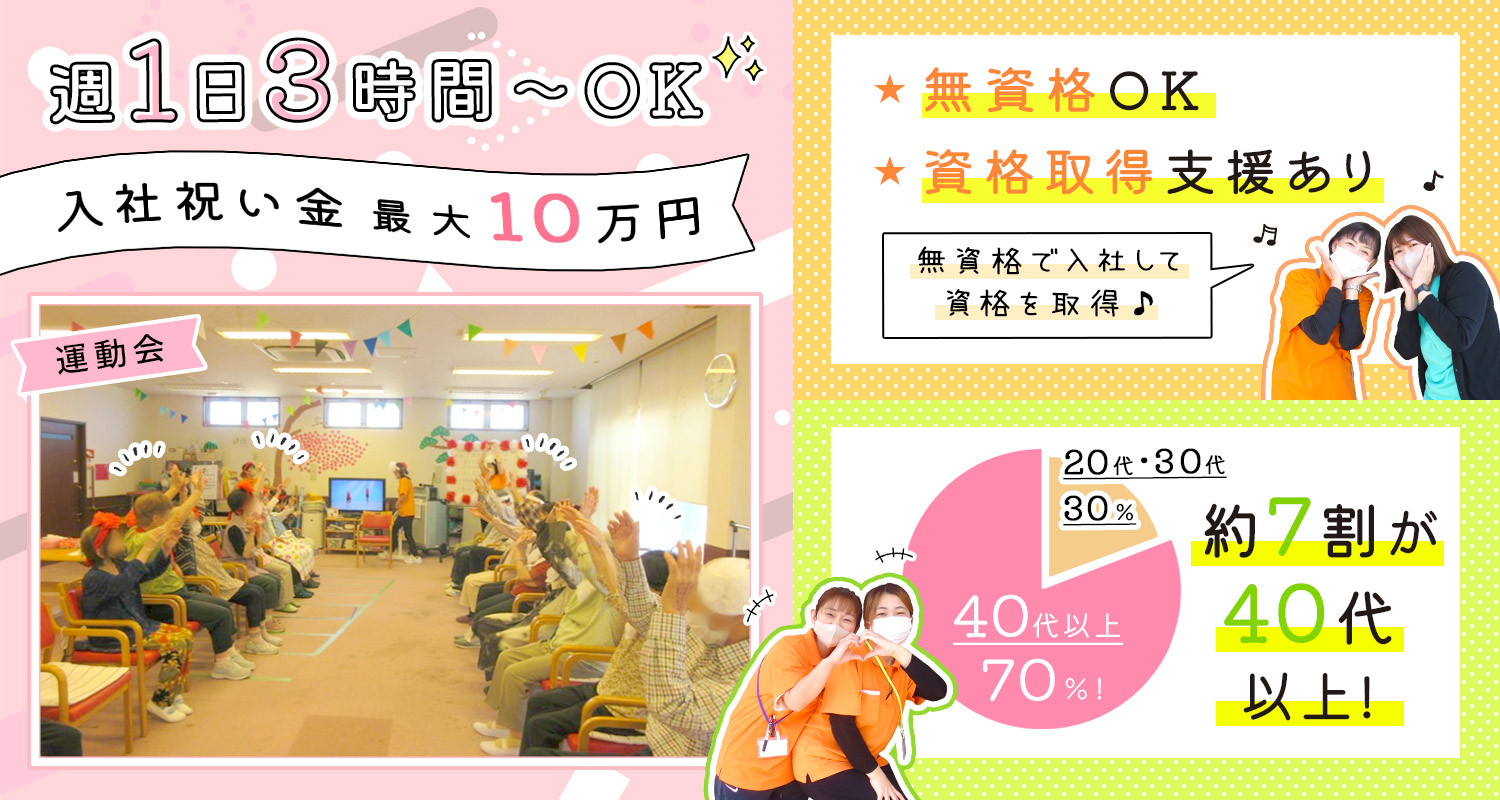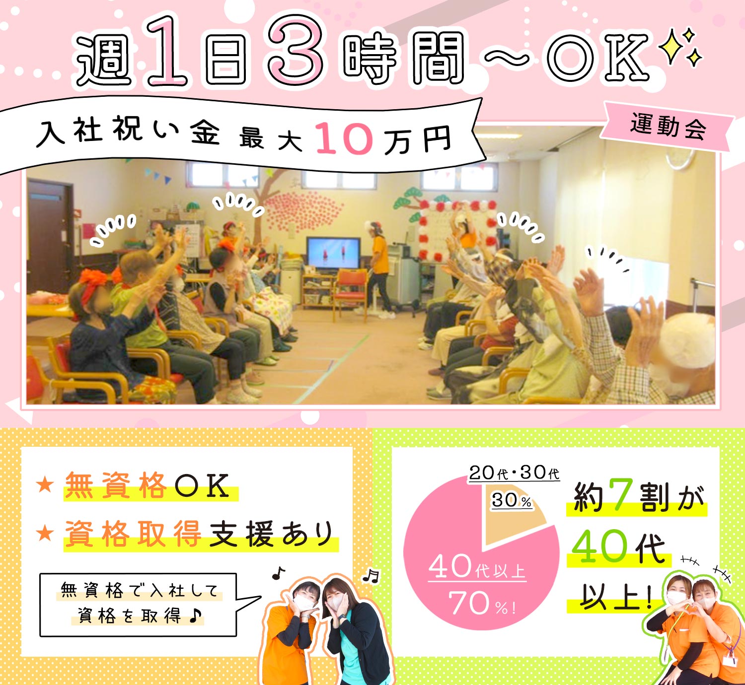 | 職 種 | 介護職 (1)無資格OK (2)介護職員初任者研修修了以上 (3)介護福祉士 |