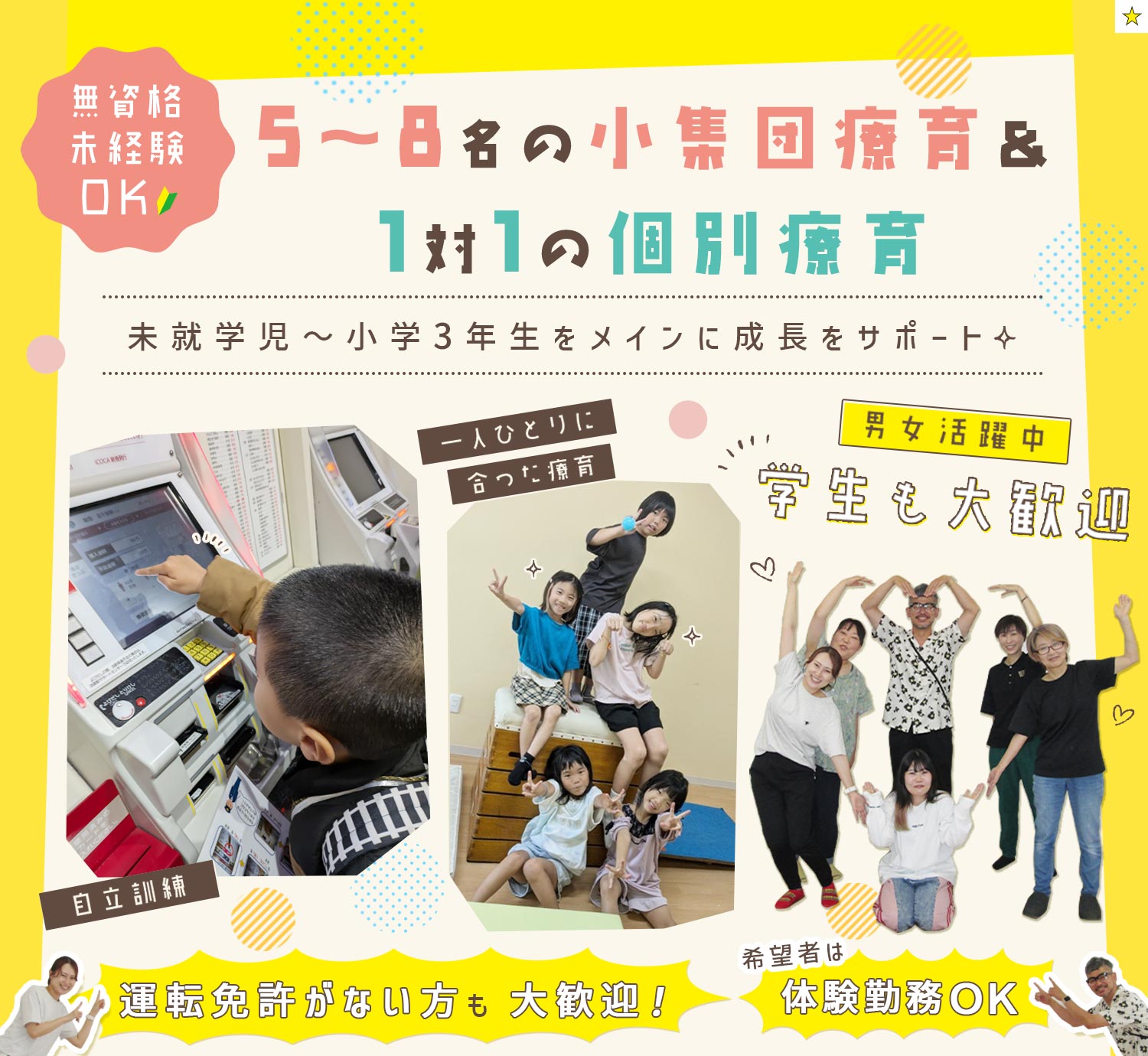 | 応募資格 | (1)保育士 ※実務未経験OK (2)無資格・未経験OK #ブランクOK ※保育園からの転職歓迎 ※今春新卒の方も大歓迎 ※教員免許(幼稚園・小・中・高いずれか)、社会福祉士、精神保健福祉士などの資格をお持ちの方も歓迎 ※保育園や学校などでの勤務経験は無くてもOK! ※児童発達支援・放課後等デイサービス未経験大歓迎! ※成人の障がい者施設経験者も歓迎! ※送迎業務なしOK |