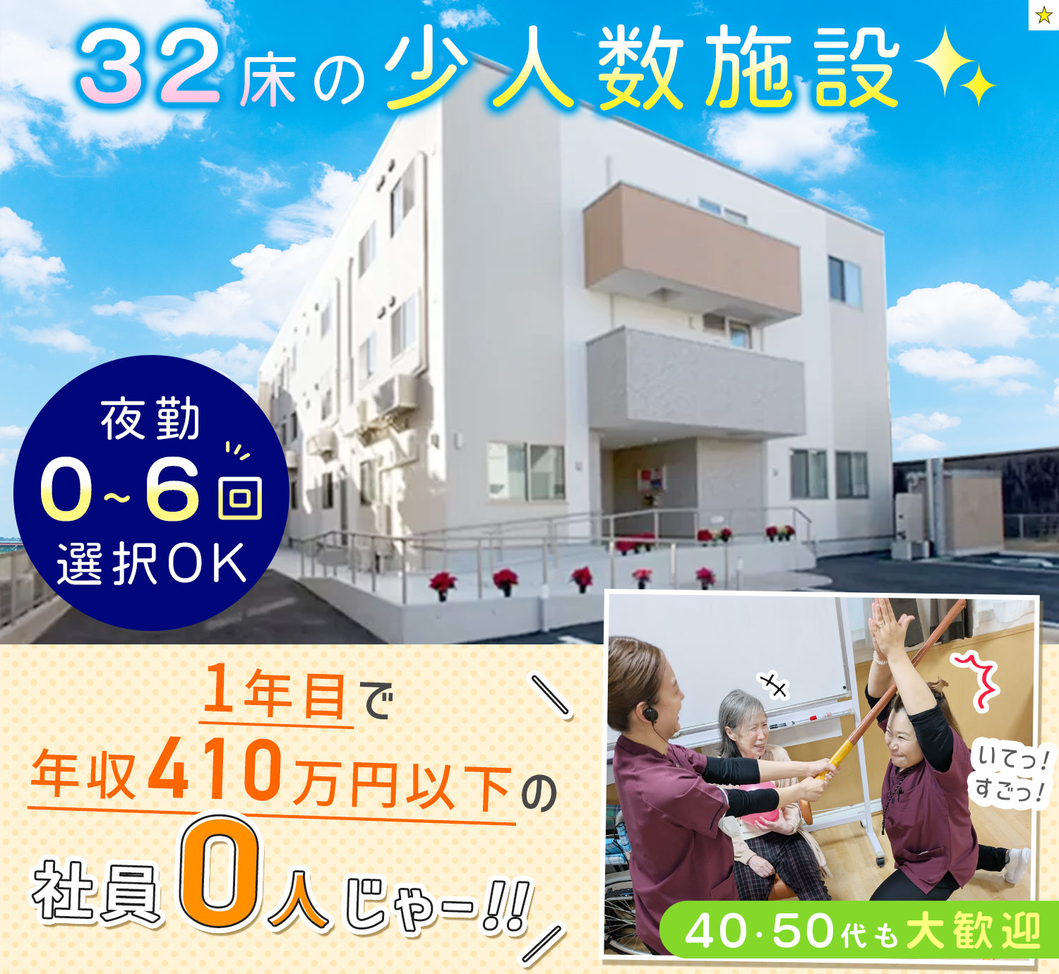 | 仕事内容 | (1)介護福祉士・平均年収440万円の介護職[社] (2)夜勤なしの介護福祉士・介護職[社] 全32床のサービス付き高齢者向け住宅での勤務。 ご入居者様の入浴介助や排泄介助、起床・就寝の介助(更衣や洗面) 掃除や洗濯、買い物代行 など(調理はありません) ※24時間看護師が常駐しています。 ・身体介護(入浴や排泄のお手伝い、お買い物の同行等) ・生活援助(入居者様のお部屋の掃除、洗濯等) など 少人数の施設で、一人ひとりに寄りそったケアを行っています。 日勤帯は常時6~7名+看護師で対応。 夜間も介護職2名+看護師1名と手厚い体制です。 |
