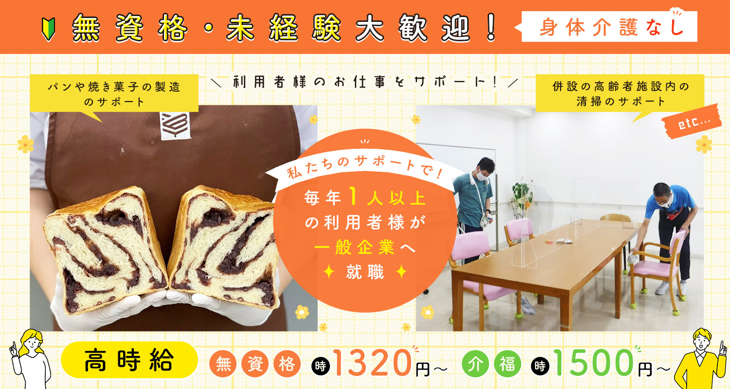 | 仕事内容 | 軽作業等の見守り/事務等から転職OK・パート[パ] 障がいのある方などが通い、清掃・製造・軽作業などの就労訓練を行う事業所での勤務。 利用者様の見守りや声掛け、お手本を見せたりアドバイス等のサポート業務、支援記録などをお願いします。 ※外出レクやイベントなども行っており、楽しく働ける環境です! <作業の一例> ・同じ建物内の高齢者施設内の清掃 ・商品の梱包や袋詰め ・イーズベイクワークス(e's BAKE WORKS)というベーカリーで焼き菓子やパン等の製造・販売 など ※身体介護(入浴・排泄・食事)なし |