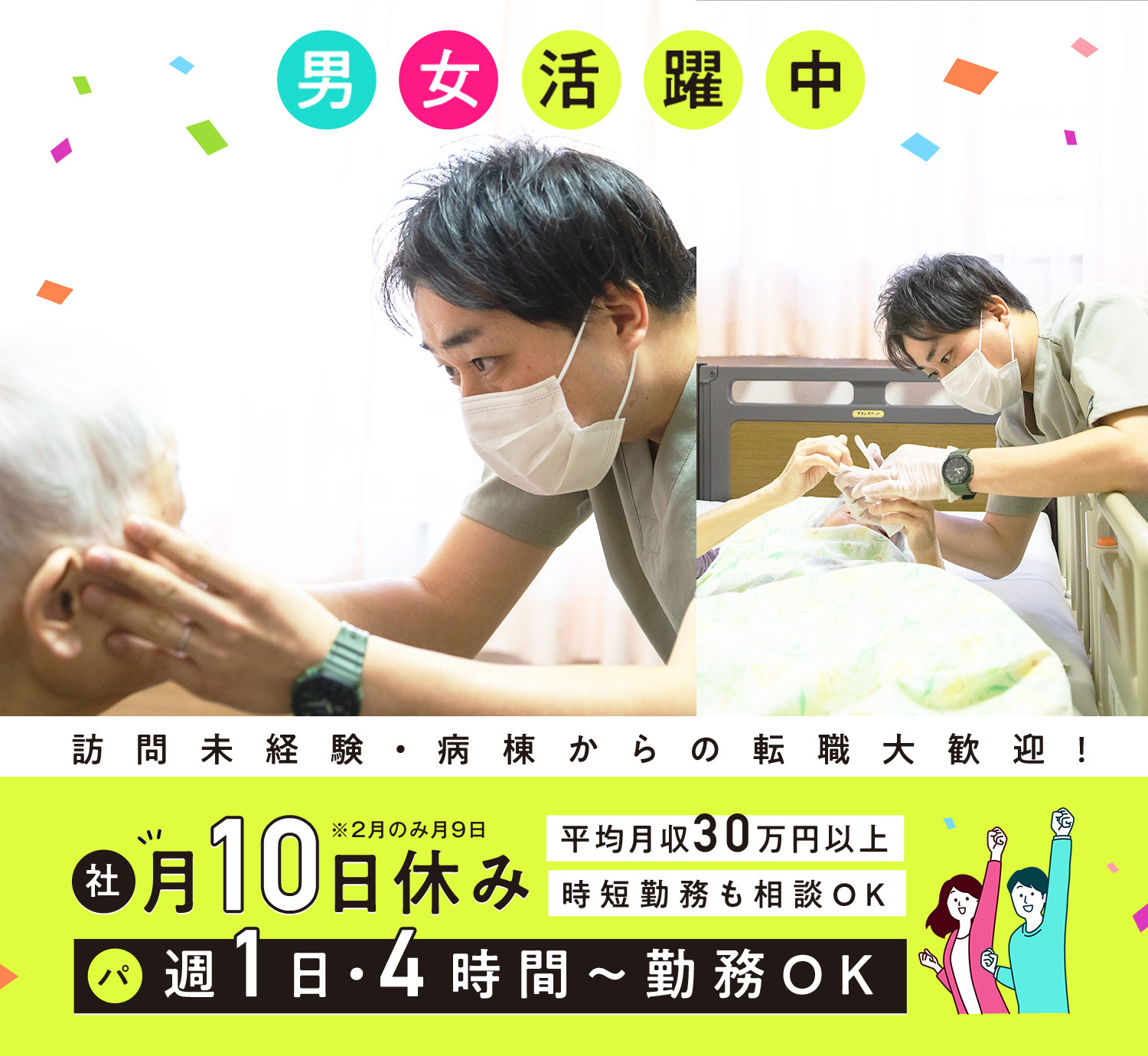 | 応募資格 | 正看護師 ※要普通自動車免許(AT限定可) ※訪問未経験OK #ブランクOK #副業・WワークOK ※病棟からの転職も歓迎 ※子育て中の方も歓迎 ※男女OK |
