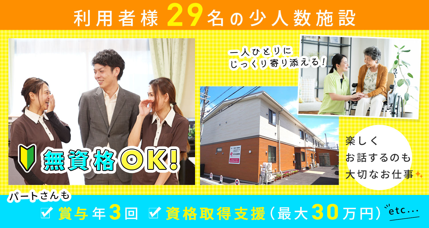 | 応募方法 | □ お気軽に【応募する】ボタンよりご応募ください □ 24時間受付中です Webからご応募いただく場合、下記内容を備考欄にご記入ください。 ご希望の連絡方法(メール or 電話) 連絡可能な日時 希望者は施設見学大歓迎!(履歴書は必要ありません) □□□ 電話での応募も受付中! 「ジ ョ ブ ポ ス タ ー を見て応募したのですが」と、 お電話すると、スムーズです! |