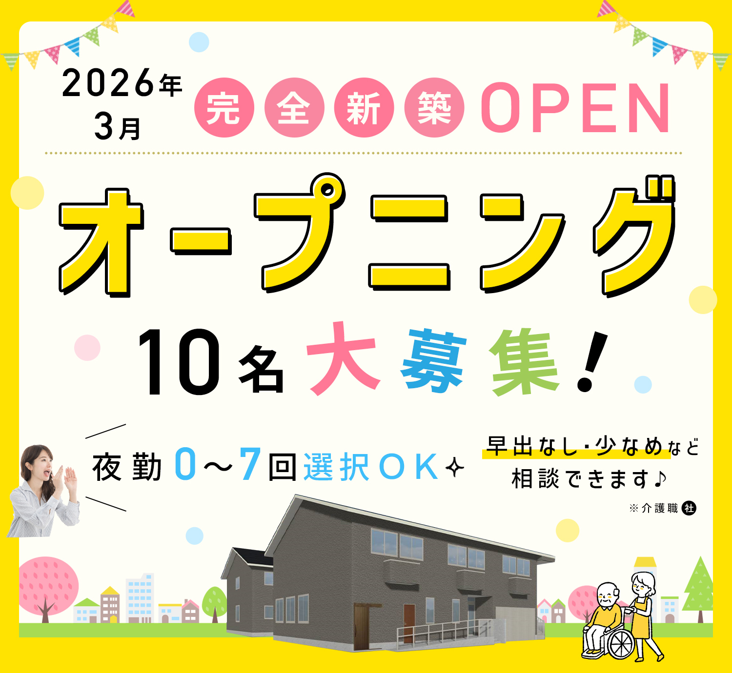 | 仕事内容 | オープニングの介護職/週2日からOK[パ] 定員33名の完全新築OPEN、住宅型有料老人ホームにて、 入居者様の身の回りのお世話(食事・口腔ケア・入浴・排泄)などをお願いします。 #オープニングスタッフ |