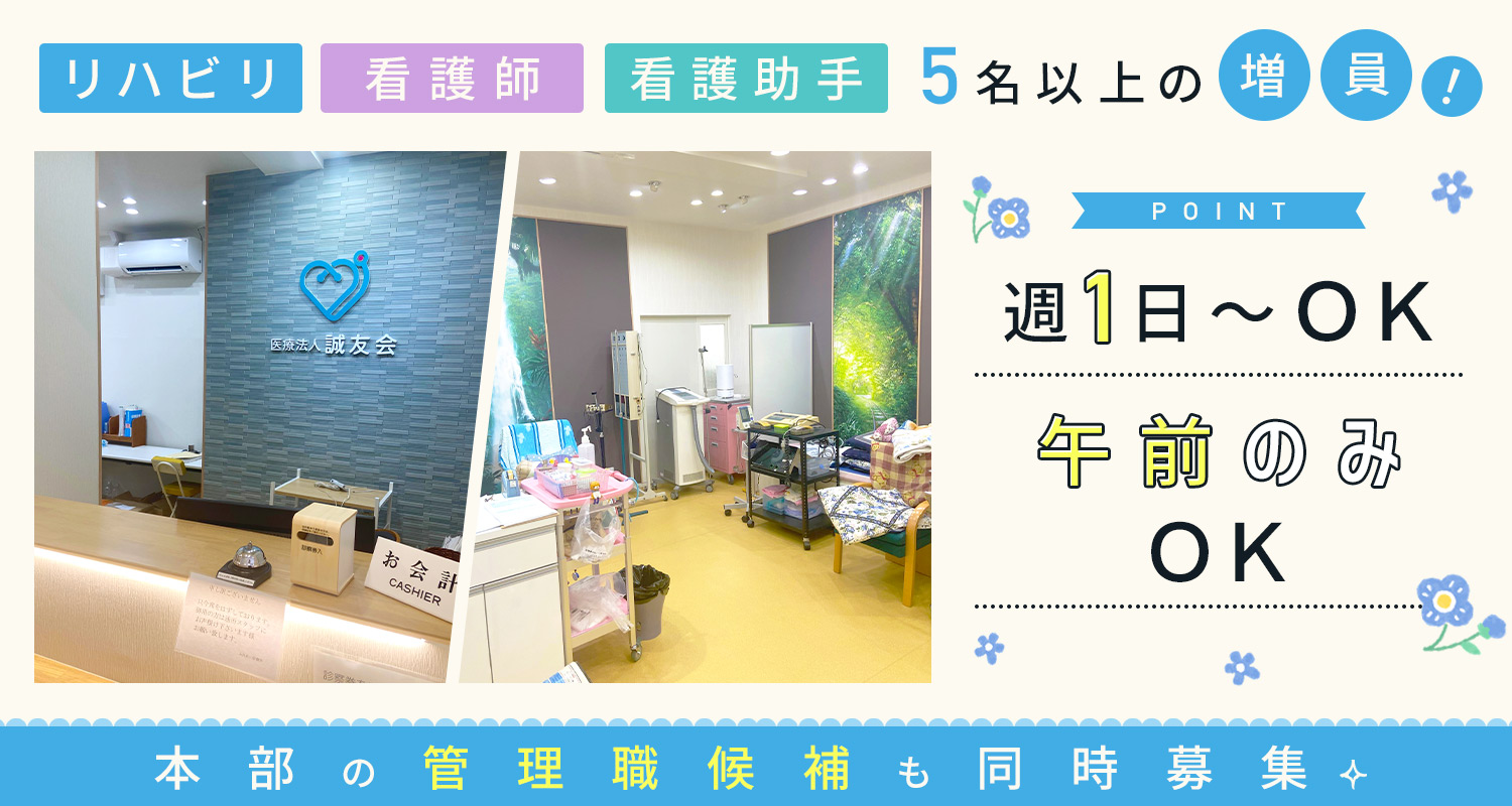 | 仕事内容 | (1)週1日からOKのPT/理学療法士[パ] (2)週1日からOKのOT/作業療法士[パ] (3)週1日からOKのST/言語聴覚士[パ] 医療法人誠友会で、通院される患者様へのリハビリ業務をお任せします。 ※通所リハビリに力を入れているので、ご経験や資格を活かせます! |