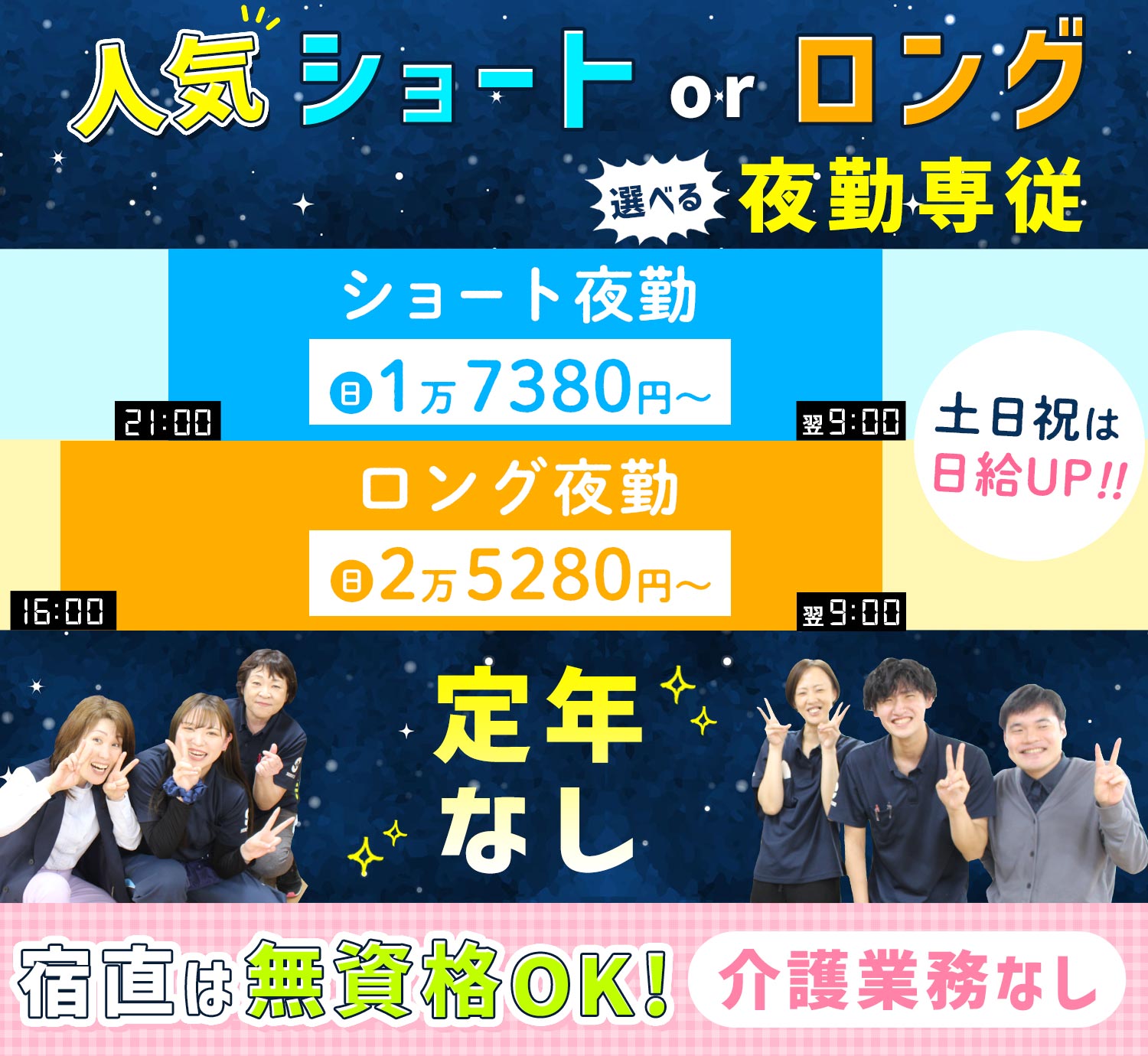 | 職 種 | (1)夜勤専従介護職(ショート夜勤) (2)夜勤専従介護職 |