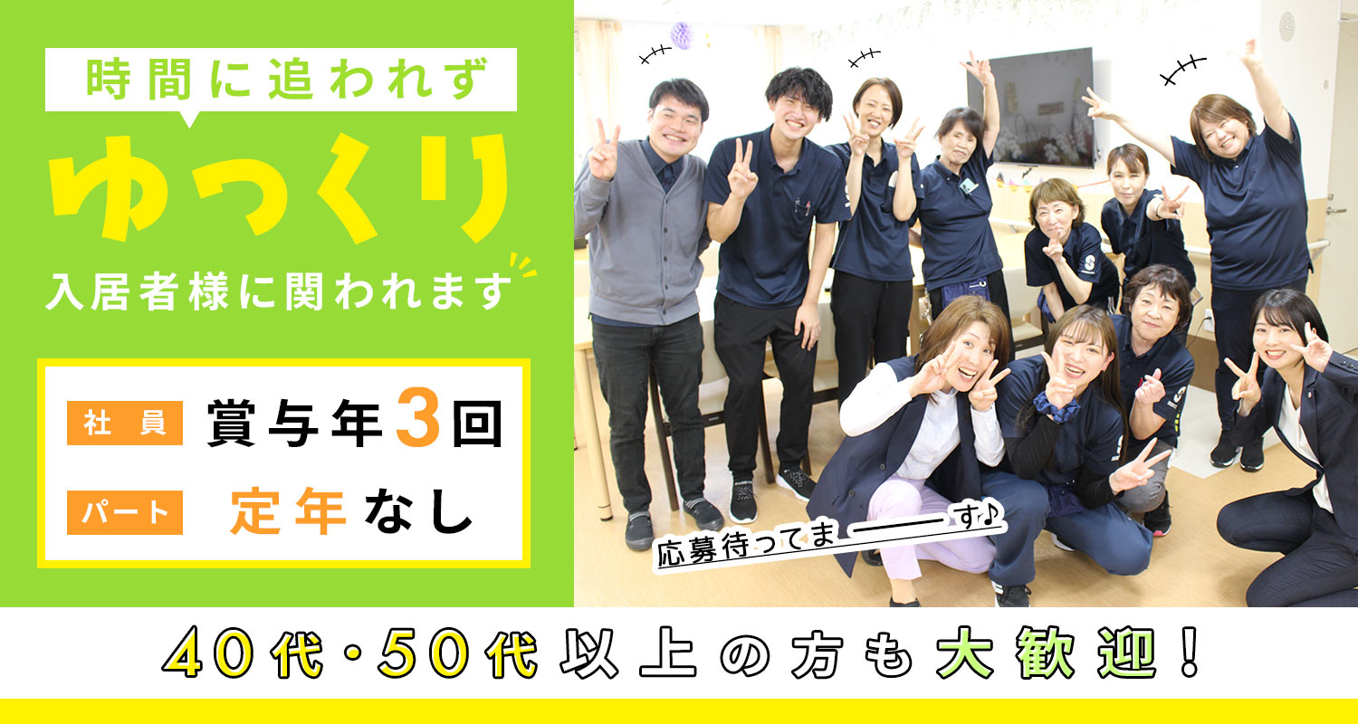 | 応募方法 | ◇ お気軽に【応募する】ボタンよりご応募ください ◇ 24時間受付中です 私服面接OK! まずは見学も歓迎!※希望者のみ 施設の雰囲気や一緒に働く仲間を見てからの応募でも大丈夫です。 □□□ 電話での応募も受付中! 「ジ ョ ブ ポ ス タ ー を見て応募したのですが」と、 お電話すると、スムーズです! |