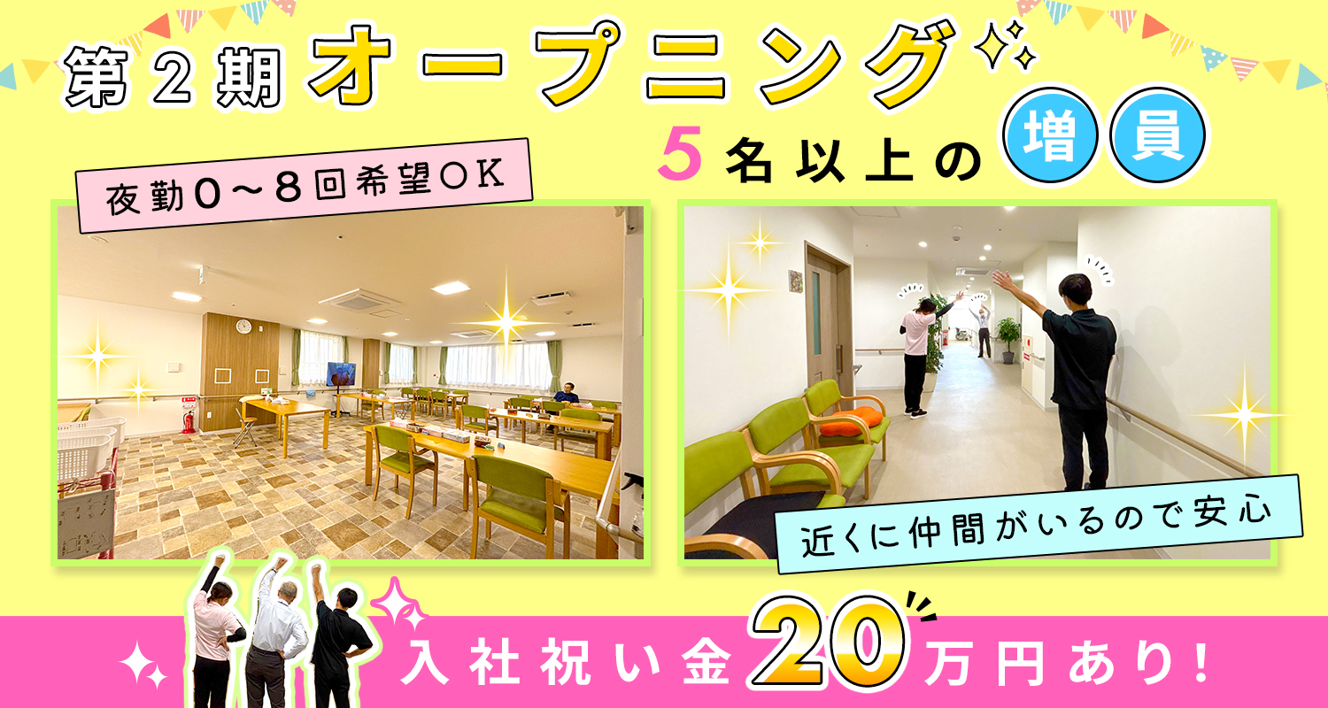 | 仕事内容 | (1)介護・介護職員/第二期オープニング[社] (2)第二期オープニングの介護・介護職員/週休3日[社] (3)第二期オープニングの介護・介護職員/夜勤8回[社] OPEN1年目(2025年春・完全新築OPEN)の綺麗な施設。 定員56名の住宅型有料老人ホームで、入居者様の身の回りのお世話(食事・口腔ケア・入浴・排泄)や、レクリエーション、季節行事の企画・実施をお願いします。 ※移動は建物内だけで負担少なく、気温や悪天候に悩まされることなし ※夜勤は2名体制で仮眠休憩もあり ※ケア記録は会社支給のスマホ・タブレットでかんたんに入力(PCも可)でき、事務作業の負担少なめ! また、機械浴を導入しており、入浴介助の負担を軽減しています。 ※寝具等の日用品はリース契約をしているので、それらの日用品の洗濯業務はありません! |