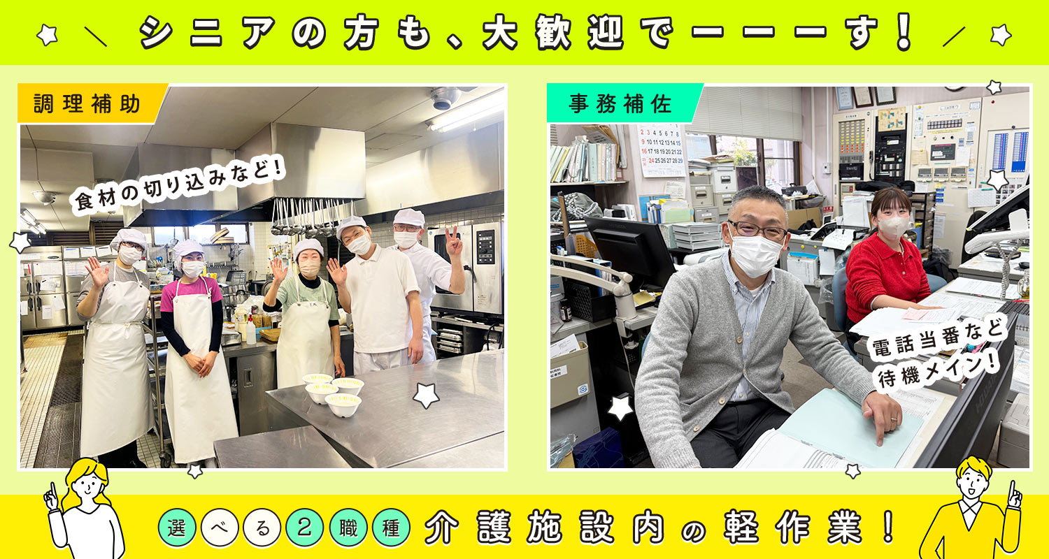 | 職 種 | (1)調理補助[パ] (2)事務補佐[パ] (無資格・未経験OK) |