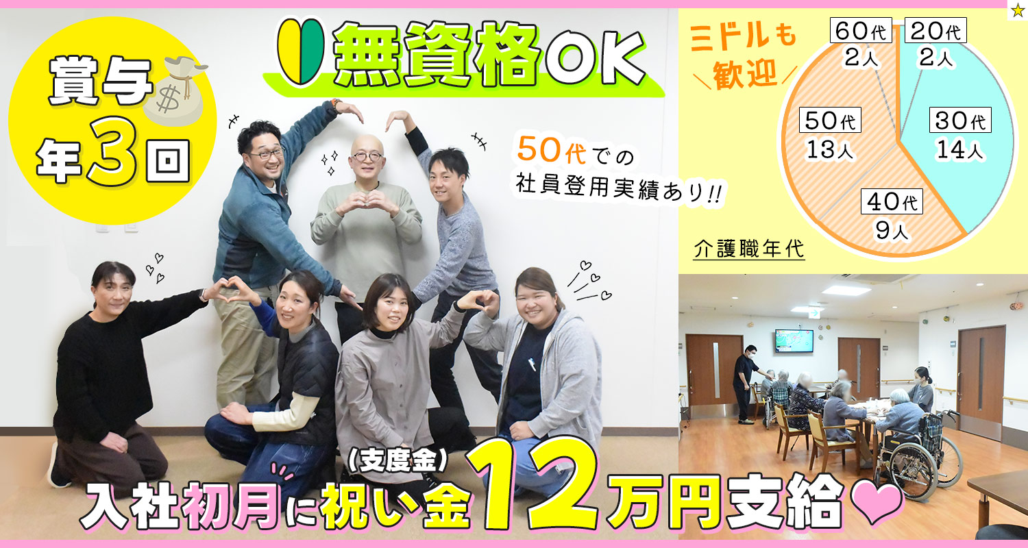 | 仕事内容 | (1)賞与年3回の介護福祉士[社] (2)賞与年3回の介護/ミドルも歓迎の介護職員[社] 1ユニット10名程のユニット型特別養護老人ホームで、入居者様の身の回りのお世話(食事・口腔ケア・入浴・排泄)や、レクリエーション、季節行事の企画・実施をお願いします。 ※フロア固定勤務 ※経験年数に合わせた研修を行います。 経験ある方は2~3回研修を行った後、早いタイミングでの独り立ちも可能。 未経験の方は、日勤帯の業務を覚えた後に2か月後から夜勤など段階を追って研修・サポートします! もちろん独り立ち後も、相談員や副施設長、施設長など頼れる人がたくさんいますのでご安心ください。 □□□ ※夜勤なしの準社員採用もあり(詳細はお問い合わせください) ※無資格でご入社される方は、入社1年以内に資格取得が必須となります。 |