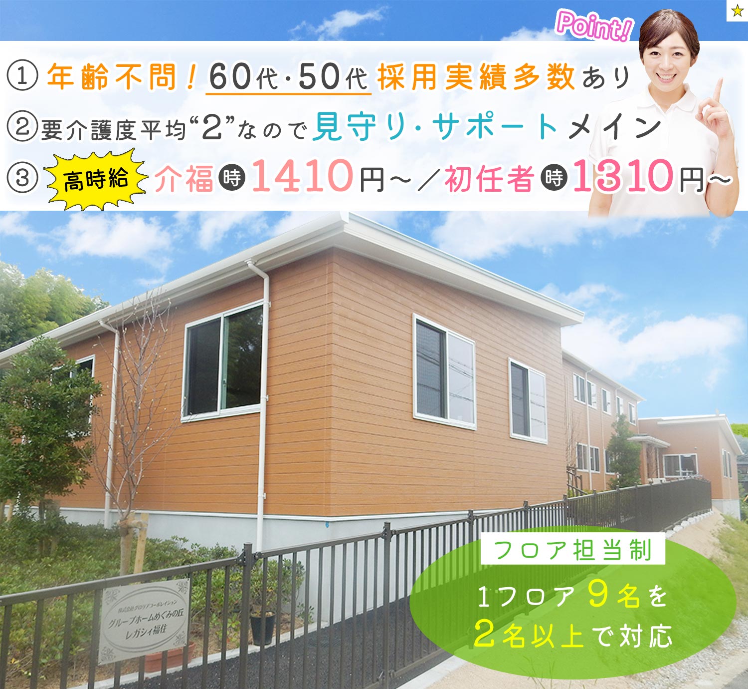 | 待 遇 | #入社祝い金あり (1万円/入社3ヶ月後に支給) ミニボーナス年2回(全員に支給!) #昇給あり #社会保険完備 (勤務時間による) #交通費支給 (全額支給) 5年勤続手当(時給50円UP) 介護福祉士手当(時給100円UP) #社員登用あり #車通勤OK バイク通勤OK 自転車通勤OK 車・バイク距離賃支給 無料駐車場あり |