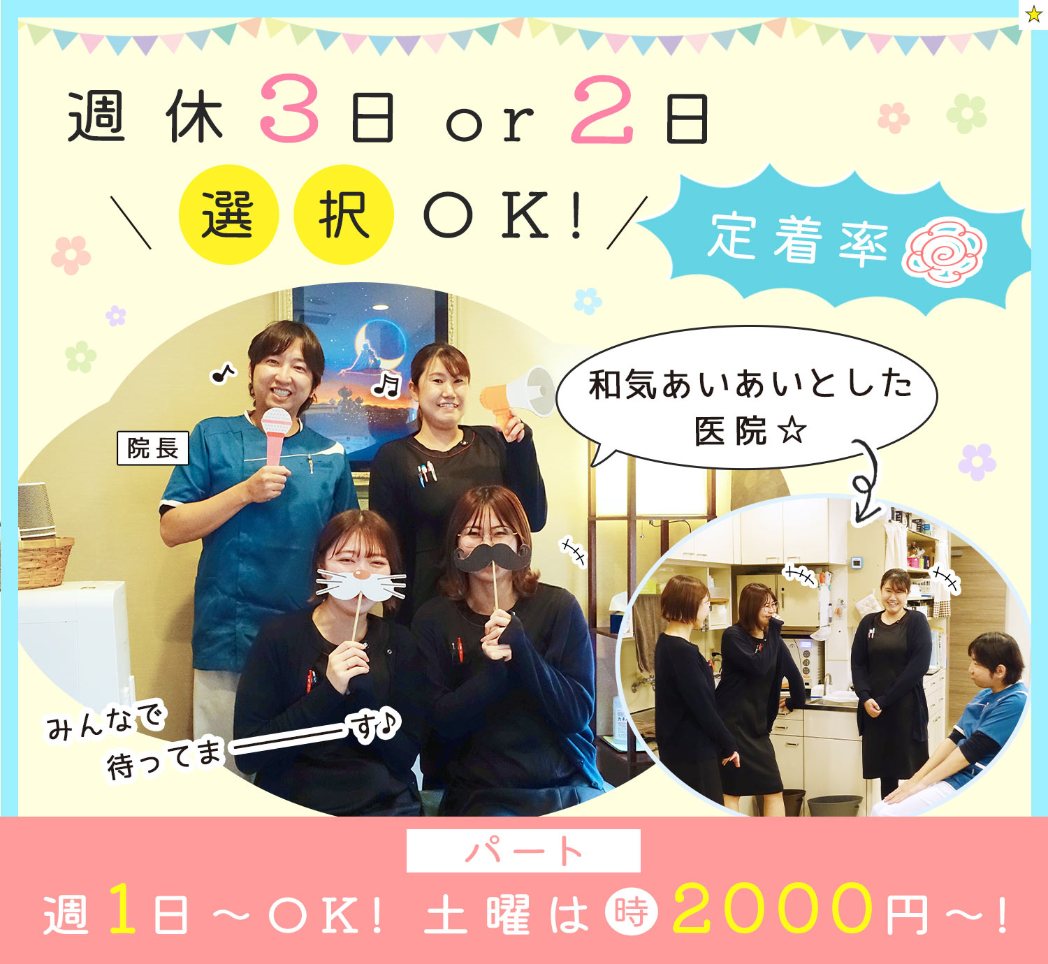 | 職 種 | (1)歯科衛生士/週休2日 (2)歯科衛生士/週休3日 |