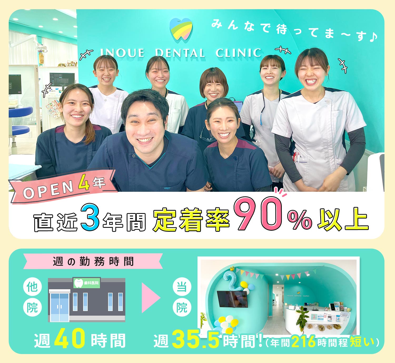 | 待 遇 | #賞与あり 年2回 #昇給あり 年1回 住宅手当 (月1万円)※交通費のかからない方 引越し費用補助(医院が一部負担) 社会保険完備 交通費規定支給 車通通勤要相談 バイク・自転車通勤OK 残業手当 (1分単位で支給) セミナー参加費用補助制度 研修制度 社割制度 退職金制度 スタッフルーム完備 髪型・髪色・ネイル自由(清潔感があり、派手すぎなければOK) |