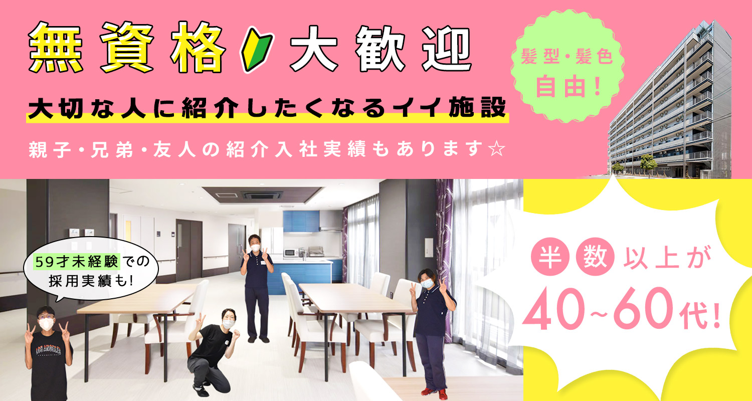 | 応募資格 | 無資格・未経験OK #ブランクOK ※シニアやミドルも歓迎 ※正社員としての勤務経験がない方もOK ※介護職員初任者研修(旧ヘルパー2級)以上や介護福祉士も歓迎 |