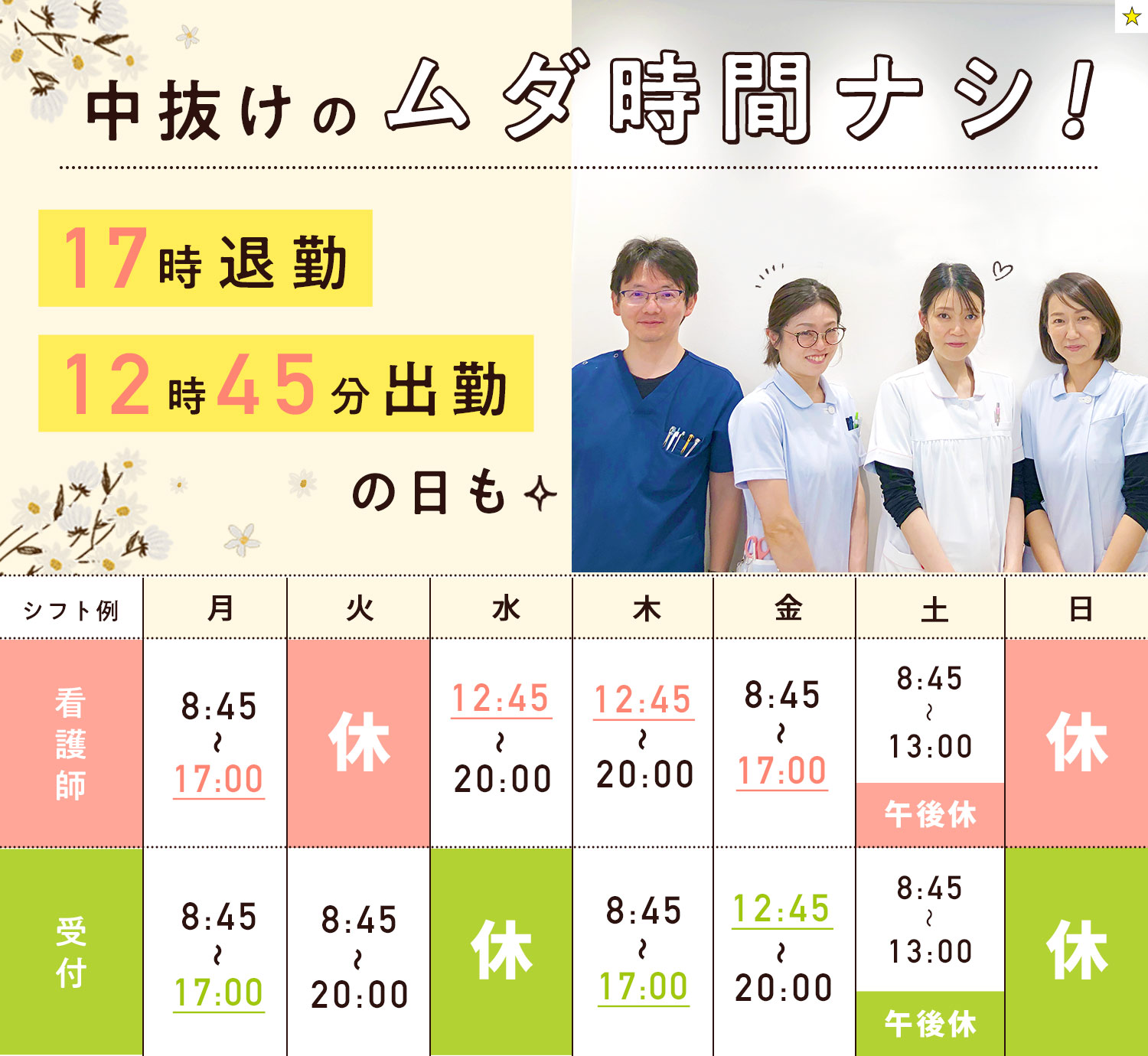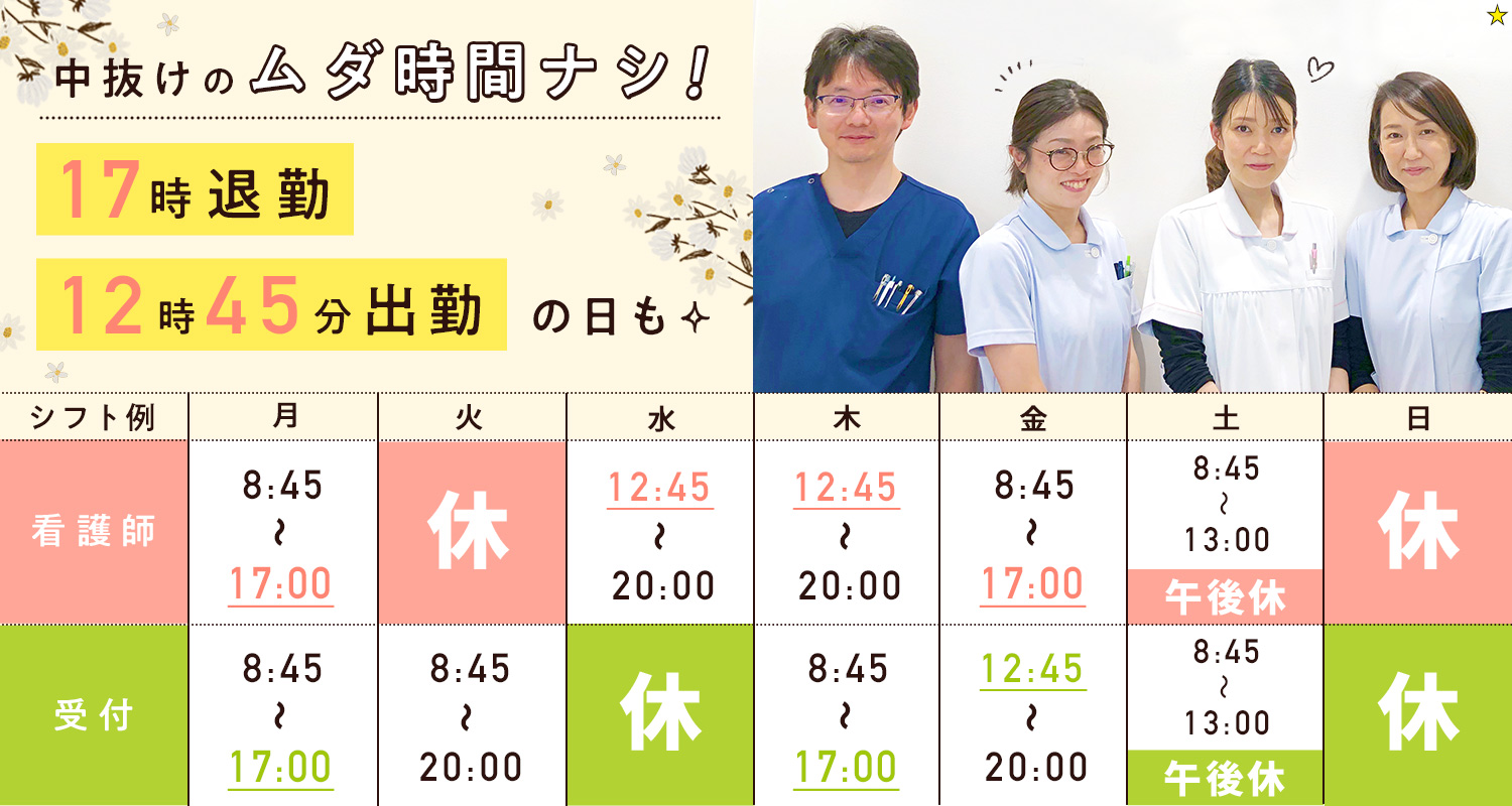 | 勤務時間 | A 朝/8:45~13:00 (4時間15分) B 昼/12:45~17:00 (4時間15分) C 夕/16:45~20:00 (3時間15分) ※土曜はA(8:45~13:00)のみで、BとCは休診 [社]上記A~Cから週9コマでシフト制 ※Cは週2回以上 ※A・B通しは休憩1時間、B・C通しは休憩45分 ※土曜日A(午前診)入れる方 ※週実働28時間15分~33時間15分 ※週休3.5日もOK(週9コマは変わらず) [パ]勤務時間はご相談に応じます! ※C(16:45~20:00)と土曜に勤務できる方は優遇! |