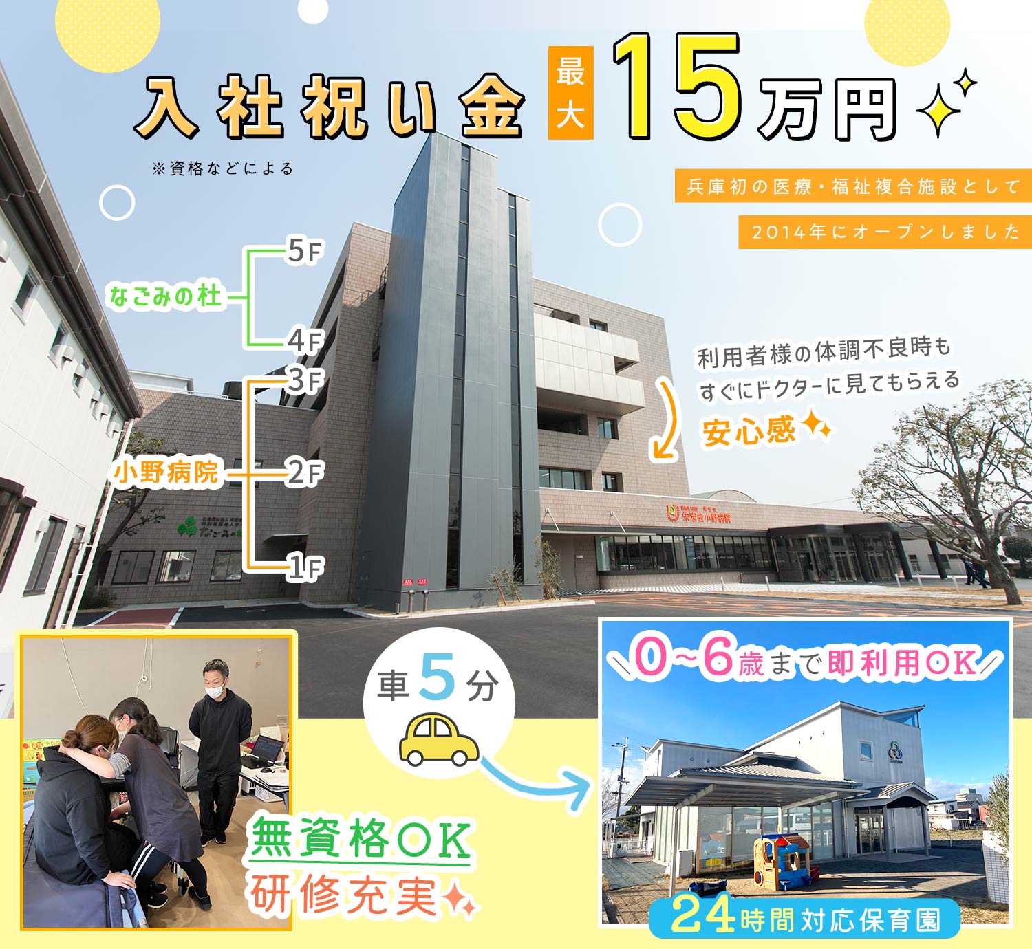 | 待 遇 | #入社祝い金あり 最大15万円(詳細は面接にて) 社会保険完備(法定通り) 交通費規定支給(月3万円まで) #車通勤OK (車通勤の方にはガソリン代を支給) バイク・自転車通勤OK 24時間対応の保育園あり※日勤帯:1日500円、夜勤帯:1回800円で利用可能 病児保育室あり アフタースクールあり※中学3年生までのお子さんが利用可能 |