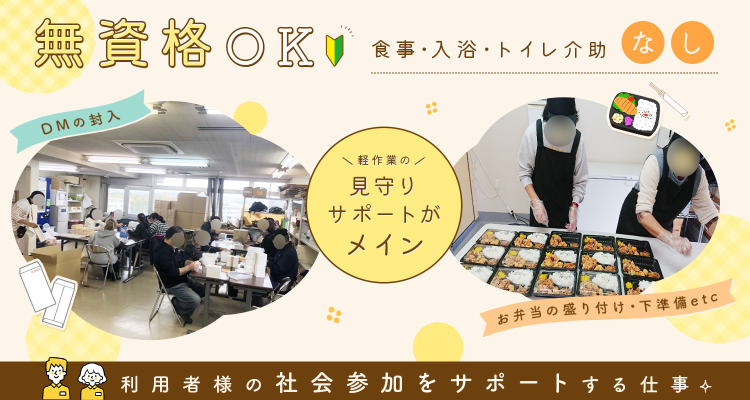 | 仕事内容 | 軽作業サポート/障がい者支援・介護[社] 利用者様の日中活動(内職)のサポートや送迎業務等をお願いします。 <活動の一例> お弁当の盛り付け・下準備 DMの封入作業、シール封入作業 お茶の梱包作業、紙ベース シール貼り など その他、資材配達回収や業者さんとの仕事のやりとり、内職の進捗管理、事務作業などもお願いします。 ※利用者様は食事やお手洗いなど身の回りのことは自分でできるため、食事・入浴・トイレ介助等の身体介助はありません! |