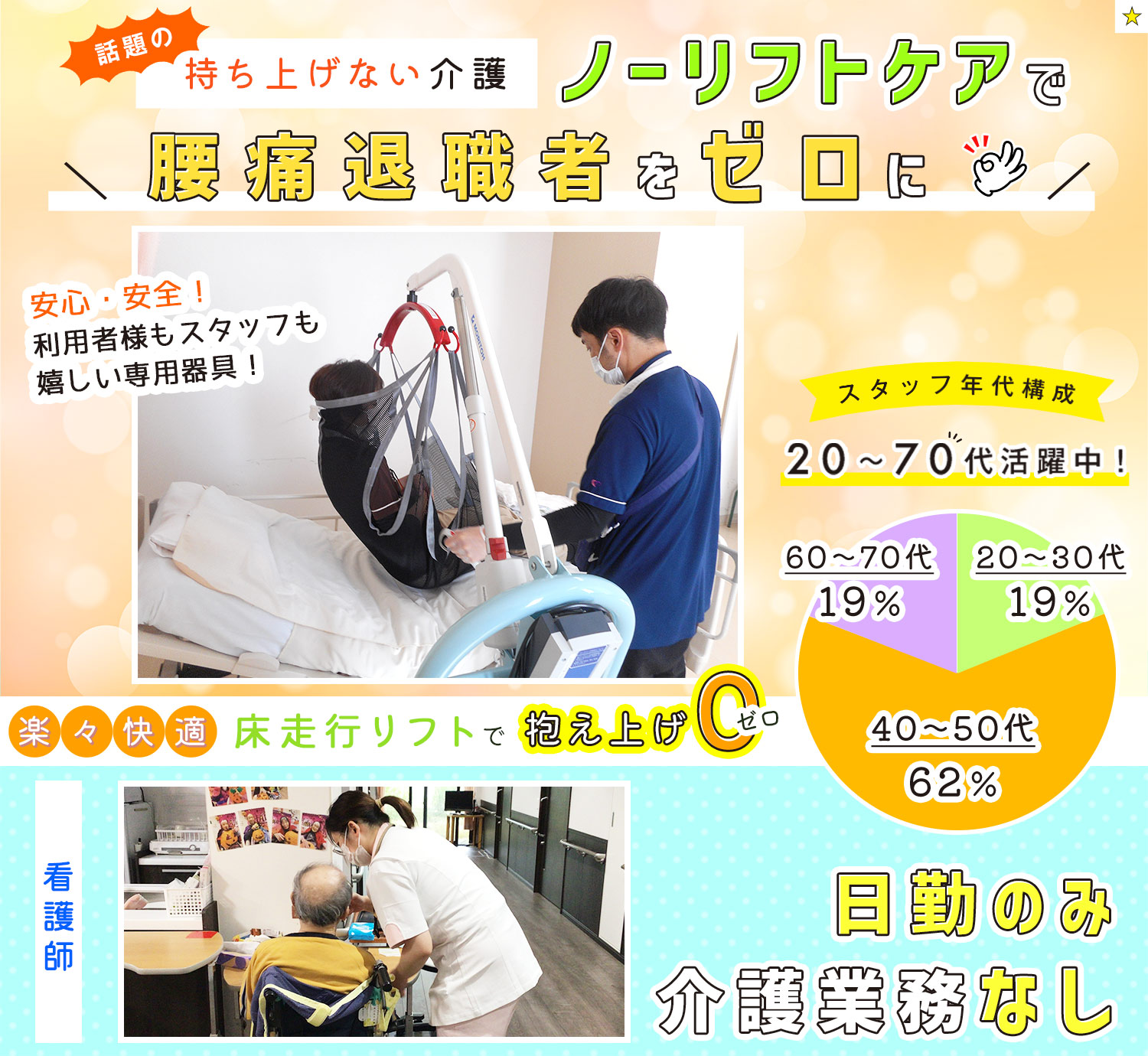 | 応募資格 | 正看護師資格をお持ちの方 #ブランクOK #50代以上応募可 ※介護施設未経験OK!病棟などからの転職も歓迎 |