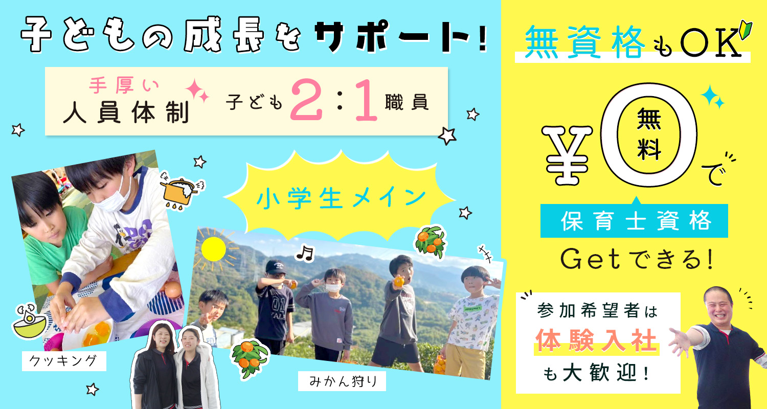 | 応募資格 | (1)無資格・未経験OK ※資格取得支援あり(費用全額補助) (2)以下いずれかの有資格者 ・保育士 ・教員免許(幼稚園・小・中・高いずれか) ・社会福祉士 ・精神保健福祉士 ・児童指導員の任用資格 ※保育園や学校で実際に働いたことのない方、実務未経験の方も大歓迎 ※児童指導員の任用資格は下記のいずれか ・教育・心理・社会福祉・社会いずれかの学部、学科などの4年制大学卒業者 ・高等学校を卒業し、児童福祉施設での実務経験が2年以上ある方 ・地方厚生局長等指定の児童福祉施設職員養成学校を卒業されている方 ※要普通自動車免許(AT限定可) #ブランクOK |