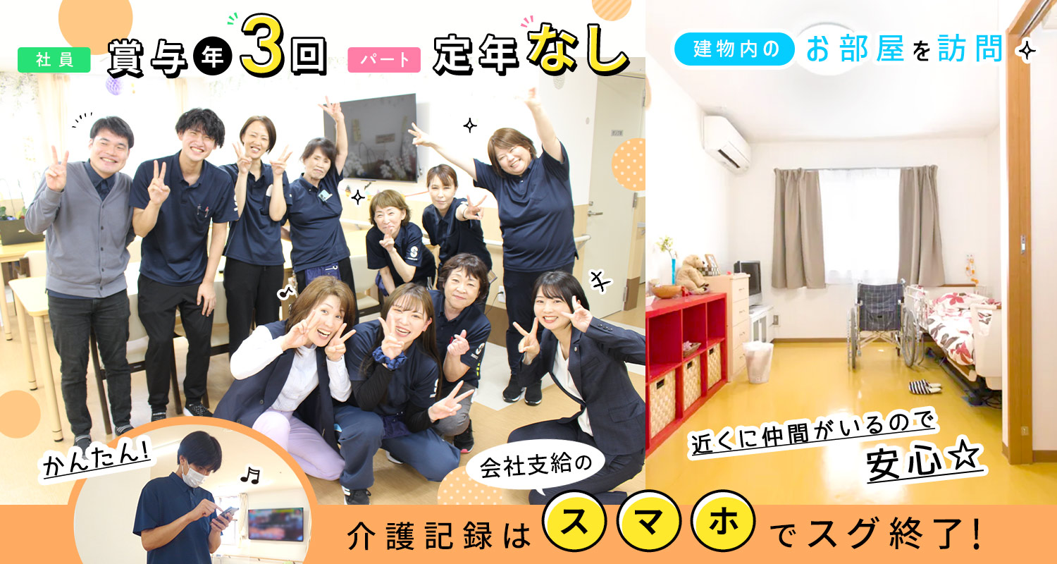 | 応募方法 | □ お気軽に【応募する】ボタンよりご応募ください □ 24時間受付中です 私服面接OK! まずは見学も歓迎!※希望者のみ 施設の雰囲気や一緒に働く仲間を見てからの応募でも大丈夫です。 □□□ 電話での応募も受付中! 「ジ ョ ブ ポ ス タ ー を見て応募したのですが」と、 お電話すると、スムーズです! |