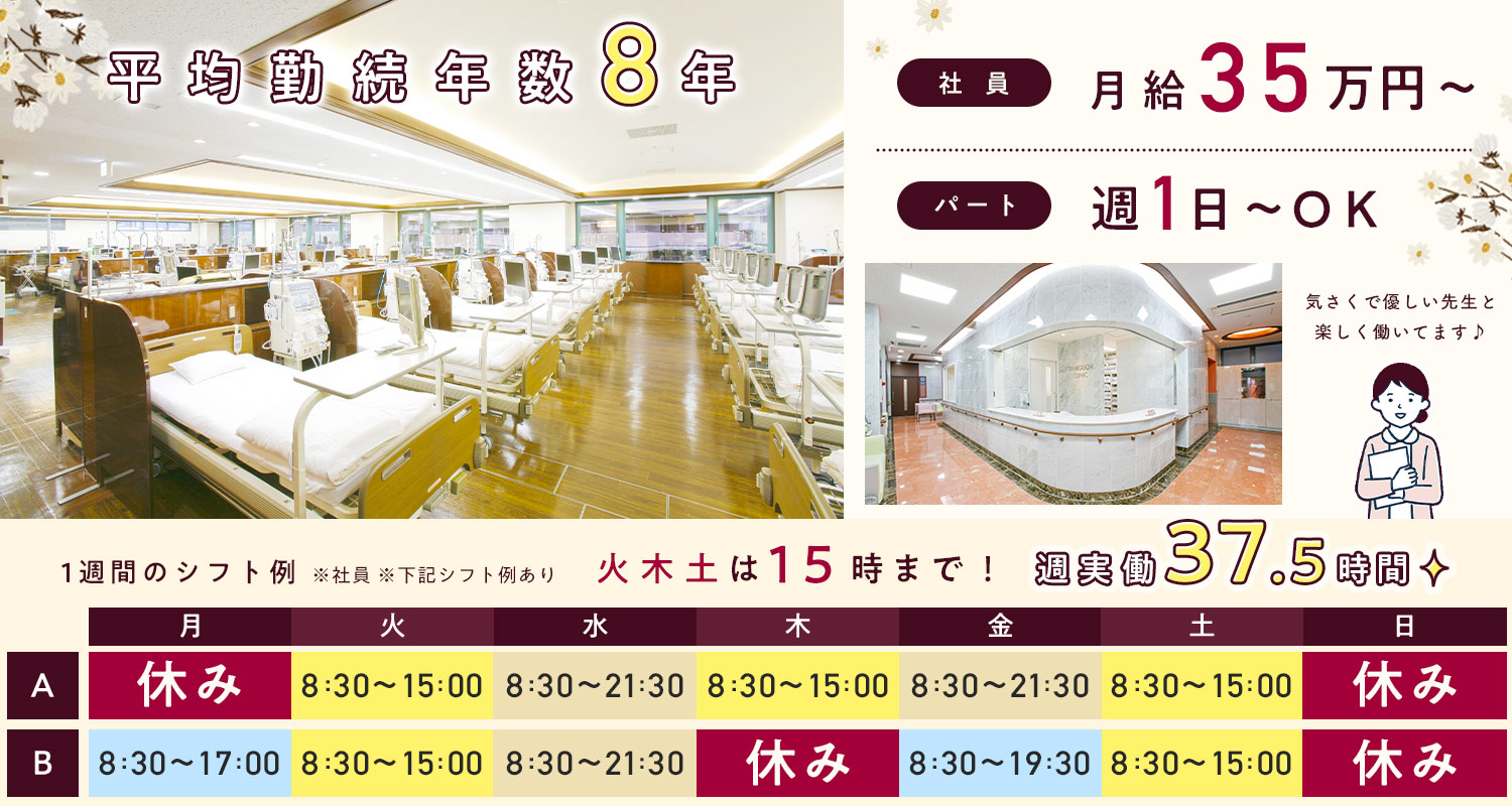 | 仕事内容 | クリニックの看護師/社員で週3回は15時迄[社] ※一般外来における看護業務 診療の補助、採血、点滴など看護業務全般 ※透析室における看護業務 穿刺・回収などの透析業務及び透析看護業務全般 ※内視鏡検査における看護業務 器具の洗浄、内視鏡検査の介助など内視鏡検査業務全般 □□□ 「いい仕事は、いいオフから」という考えのもと、ワークライフバランスの充実に努めている当院。 スタッフ増員で、今以上に働きやすい環境を整えます! |