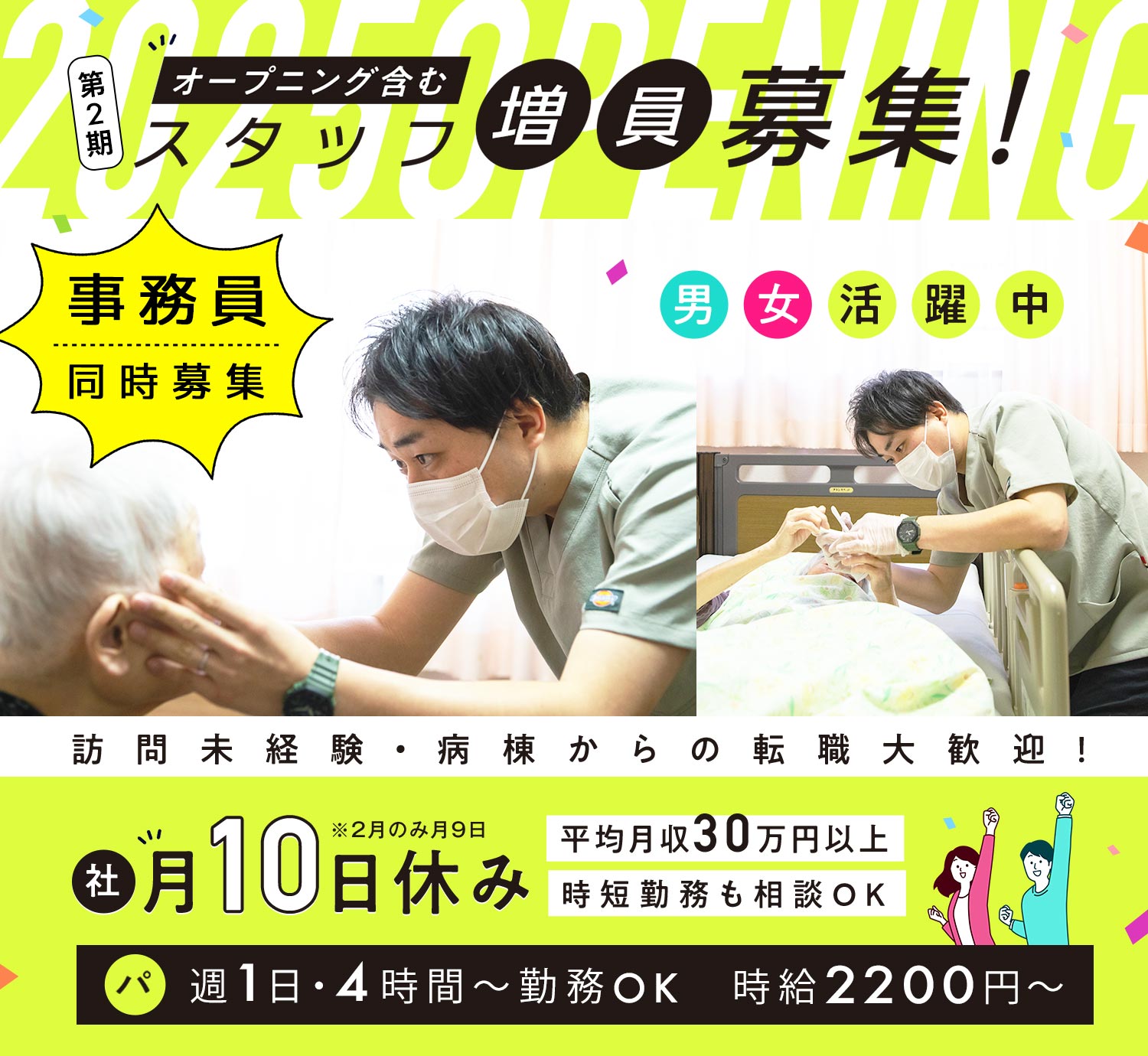 | 給 与 | 時給2200円~ ※土日祝は時給100円アップ ※試用期間1ヶ月(同条件) |