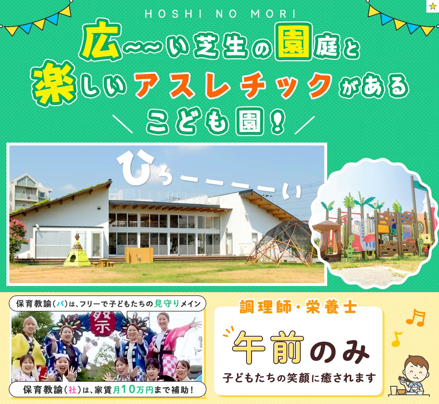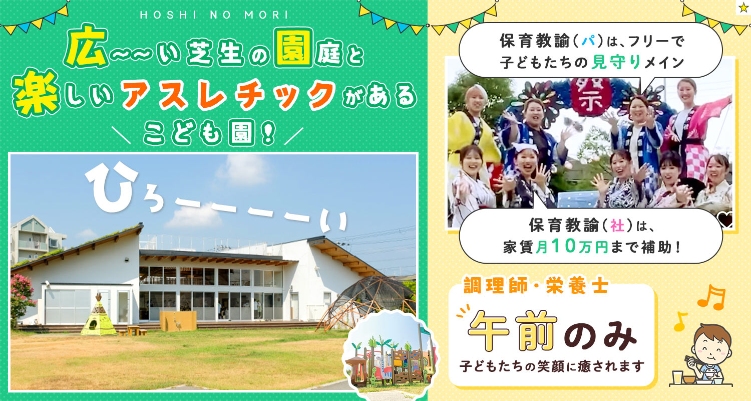 | 仕事内容 | (1)週2日からOKの保育教諭[パ] (2)保育教諭・保育士/時間固定のフルタイム[パ] 「幼保連携型認定 星の杜こども園」でのフリー教諭として0歳~5歳のいずれかのクラスのサポートをお任せします。 異年齢の関わりを大切に、思いやりの気持ちを育む保育をお願いします。 ※持ち帰り仕事ナシ・残業ほぼナシ 【子どもたちも保育教諭もわくわくする環境!】 星の杜こども園の広大な敷地だからこそ、園庭には恐竜をモチーフにしたアスレチックがある他、隣接する里山には、ピザ窯やバーベキュー、流しそうめんを楽しめる広場があったり、木で作ったすべり台やブランコを設置!たけのこやしいたけ狩りも楽しめます! また、園内にもジャングルジムや子どもたちが走り回れる大きなスペースがあるなど、子どもたちはもちろん、保育教諭も一緒にわくわくしながら楽しめる環境です◎ 自然豊かな広大な土地を活かし、隣接する里山で様々な初めての自然体験を通して、できることが増えたり、友達との協調性を育んだり、 大きな園庭のアスレチックで、高いところが苦手な子が勇気を出して登れるようになったり、毎日子どもたちからたくさんの驚きと感動をもらっています! そんな成長を親御さんにお伝えしてとても喜んでいただけた時は、まるで自分のことのように嬉しい気持ちになれますよ◎ |
