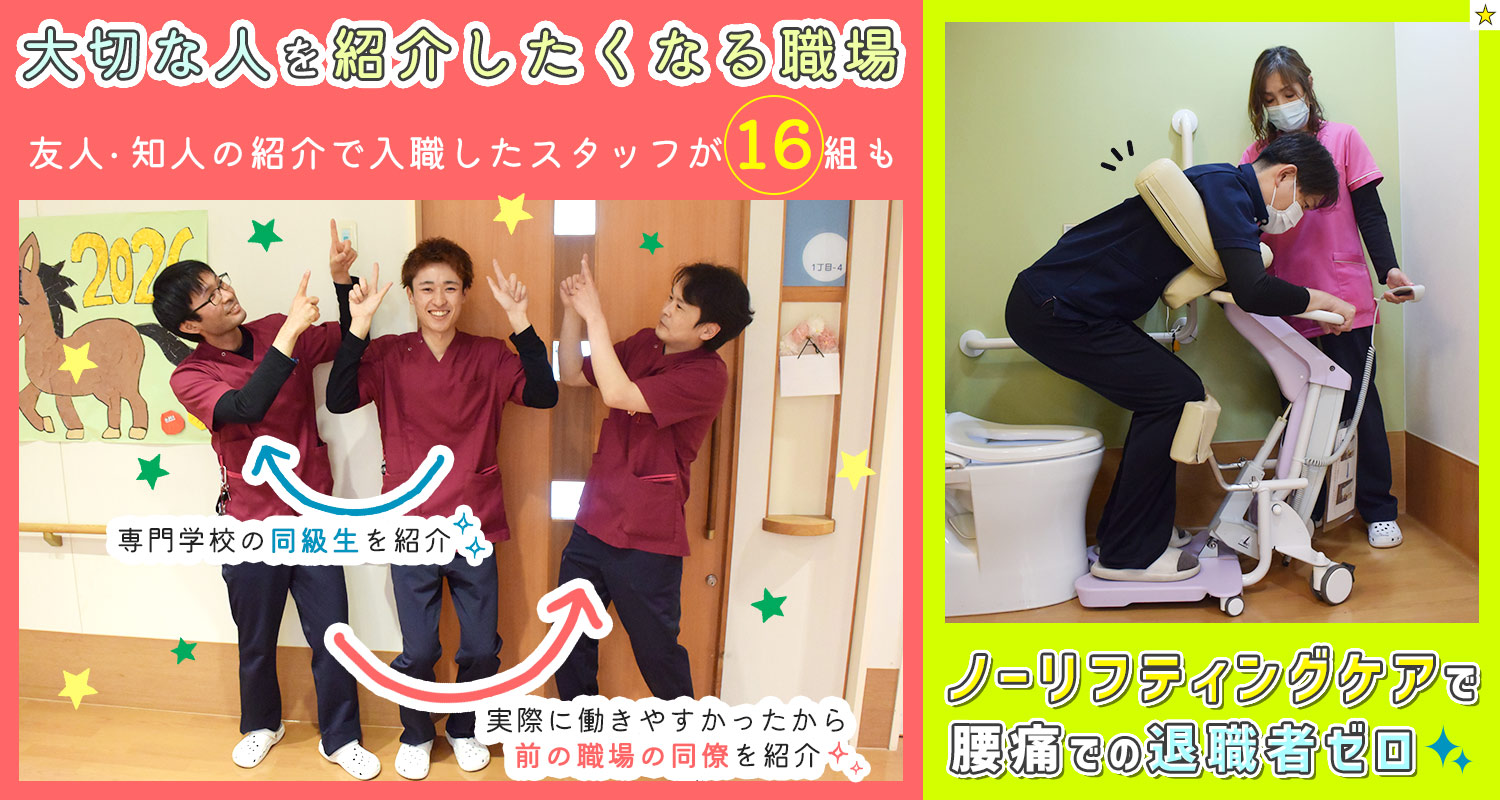 | 仕事内容 | (1)介護職/無資格やミドルも歓迎[社] (2)介護福祉士[社] 利用者様の在宅復帰に向けたリハビリ・機能訓練のサポート。 その他、入浴や食事など身の回りのお世話、レクリエーションの企画・実施など、介護業務全般をお願いします。 ※特別浴室を完備 リフト付き個室浴1台、ストレッチャー式シャワー浴2台、パーソナルケア個浴3台の計6台の浴室があり、様々な介護度や障がいに対応しています。 また、2名体制で一人ひとりの負担を軽減しています。 他にも足湯、屋上庭園や明石海峡大橋を一望できる眺めも当施設の自慢です! ※無資格・未経験OK 最初は研修担当の先輩が2名つき、サポートしていきます。 研修では座学で基礎知識を学ぶところからスタートし、リフトの使い方まで丁寧にレクチャーしますので「介護が初めて」という方もご安心くださいね! 実際、前職はお弁当屋さんだった方など異業種から転職してきた方も数多く活躍しています。 □□□ また、施設内には介護職や看護師、リハビリスタッフなど合わせて常時50名以上が働いており、必ず先輩が近くにいる環境なので安心して業務に取り組めますよ! |