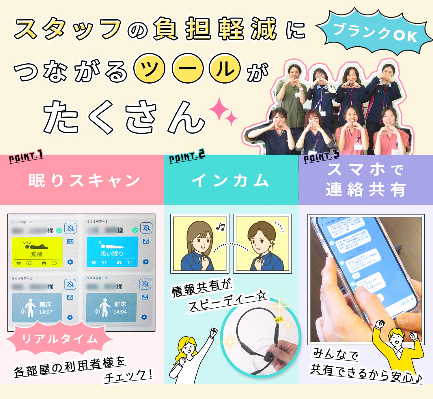 ・職員同士がリアルタイムで連携できるインカムを完備