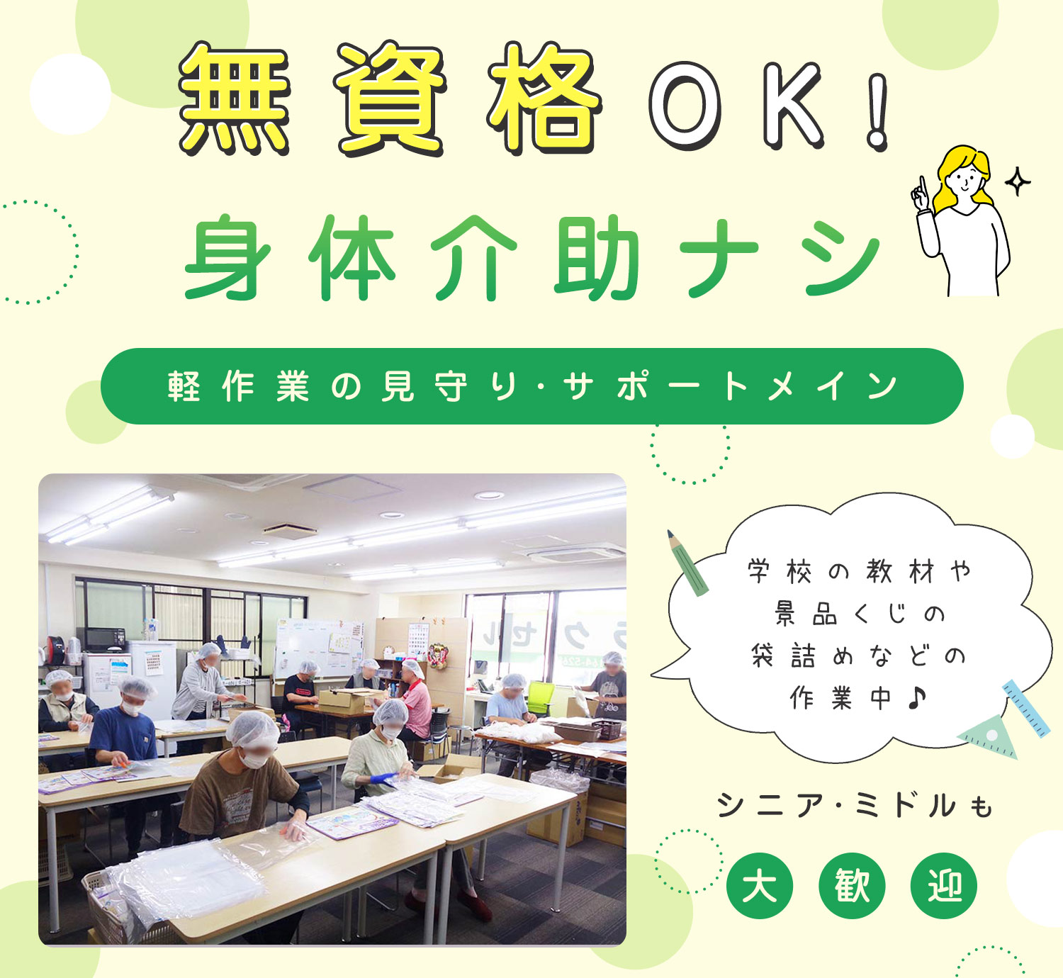 | 仕事内容 | 軽作業の見守り生活支援員/障がい支援の介護職[パ] 障がいをお持ちの方が円滑に作業できるように、見守り、声掛け、お手本を見せる等のサポートをお願いします。 ※その他、作業の準備や片付け、記録など ※介助業務や難しい作業はありません ※定員は1日20名 ※当事業では学校の教材やお祭り・イベントなどの当てもの(景品くじ)の袋詰めなどを行っており、利用者様の得意なこと等を考慮し、お任せする作業を決めています。 <1日のスケジュール> 10:00 朝礼、作業開始(途中、利用者さんは1時間ごとに休憩) 12:00 お昼休憩 13:00 作業再開 14:40 作業終了(利用者さんはここで退勤) 15:00 退勤(残業ナシ!) |