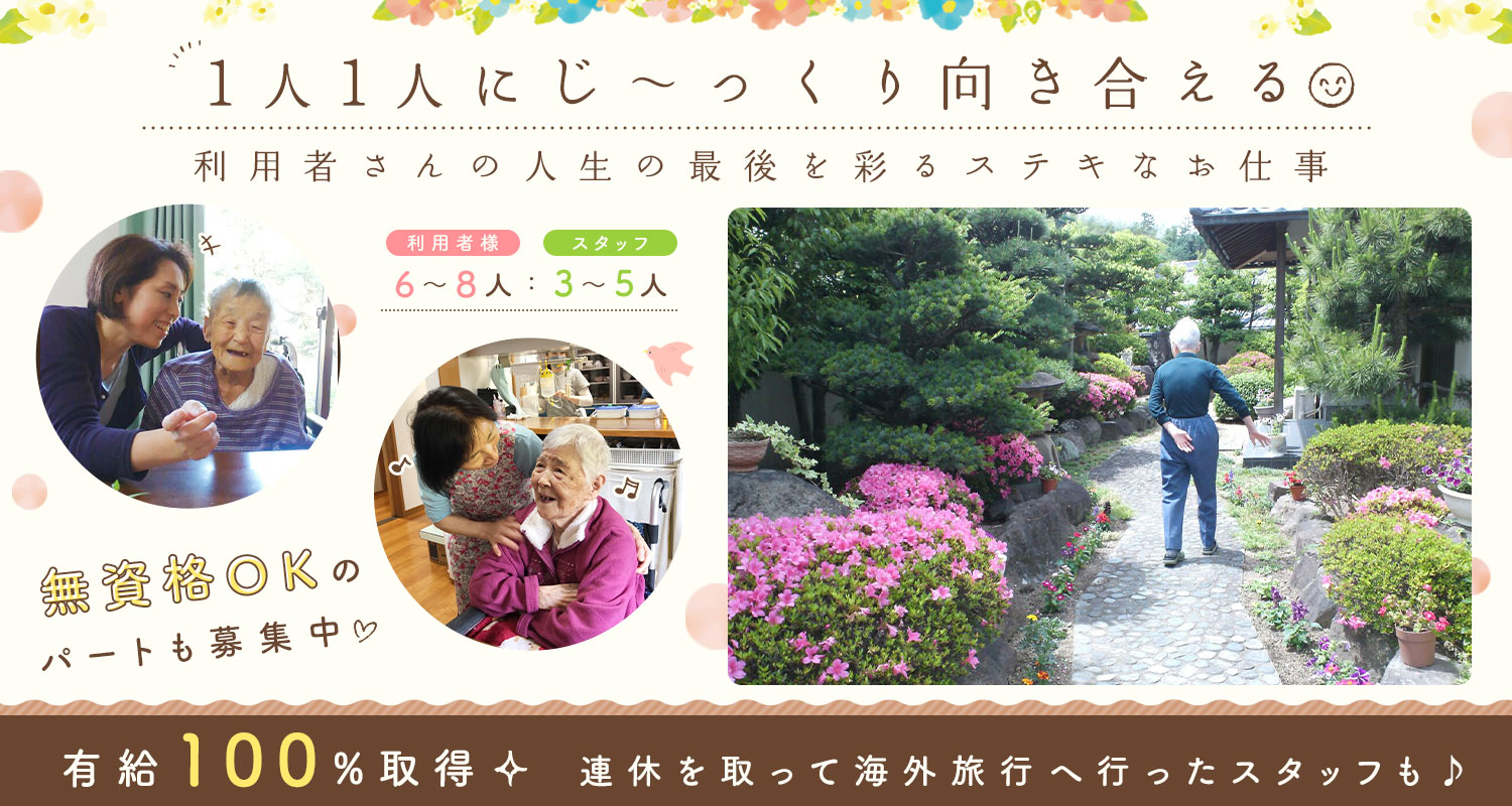 | 仕事内容 | (1)介護職/週1日からOK[パ] (2)無資格OKの介護職/週1日からOK[パ] 定員8名のホスピスホームで介護業務全般。 ※レクリエーションなし 入居者様はご自宅で過ごすようにゆったりと過ごしています。 ※現在入居者様7名に対して、日勤スタッフ約4名の<2:1>以上の体制。 お一人お一人に寄り添ったケアを行っています。 ※(2)資格取得までは、掃除や洗濯物を畳んだりと家事の延長でできる業務をお任せします。 <安心・万全の医療体制> 日勤帯は看護師が常駐しています。 また主治医による定期診察もあり、いつでも相談できる体制もとっています。 □□□ <病棟看護師として勤務していた代表が立ち上げたホーム/代表の想い> 医療が進歩する一方、延命治療が当たり前になっていく現場に疑問をいだくようになりました。 「この方にとって本当に幸せなこととは何なのか」を問い続けたことが「ほほ笑の森」設立のきっかけです。 ここは治療の場ではなく、その人らしく穏やかな日常を過ごせる場所です。 入居者さまの生活に丁寧に寄り添ってくださる方と一緒に働けることを楽しみにしています。 |