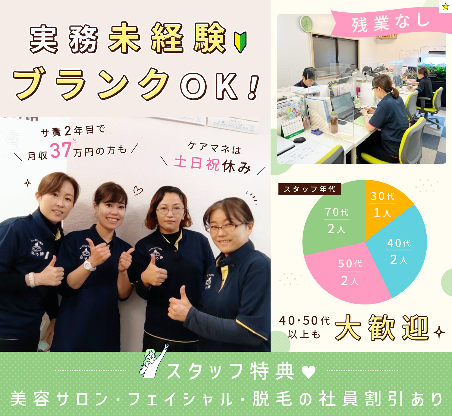 | 待 遇 | #賞与あり #昇給あり #昇格あり 社会保険完備 交通費規定支給(月3万円まで) #車通勤OK (駐車場完備) バイク・自転車通勤OK(駐輪場完備) 資格取得支援制度 ※規定あり 美容サロン従業員割引(ファイシャル・脱毛・エステなど) 電動自転車貸与・購入支援制度 制服貸与 髪型・髪色自由 定年60歳 再雇用制度(65歳まで) |