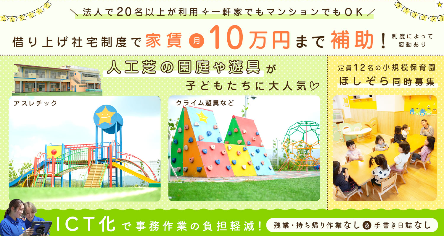 | 会社情報 | 社会福祉法人愛心会 幼保連携型認定 星の子こども園 □□□ ※園の雰囲気や保育士のあるある、子どもたちに人気の遊びやダンス、愛心会の良いところなど、YouTubeショート動画やInstagram、TikTokで公開中!ぜひ、ホームページからクリックしてご覧ください! |