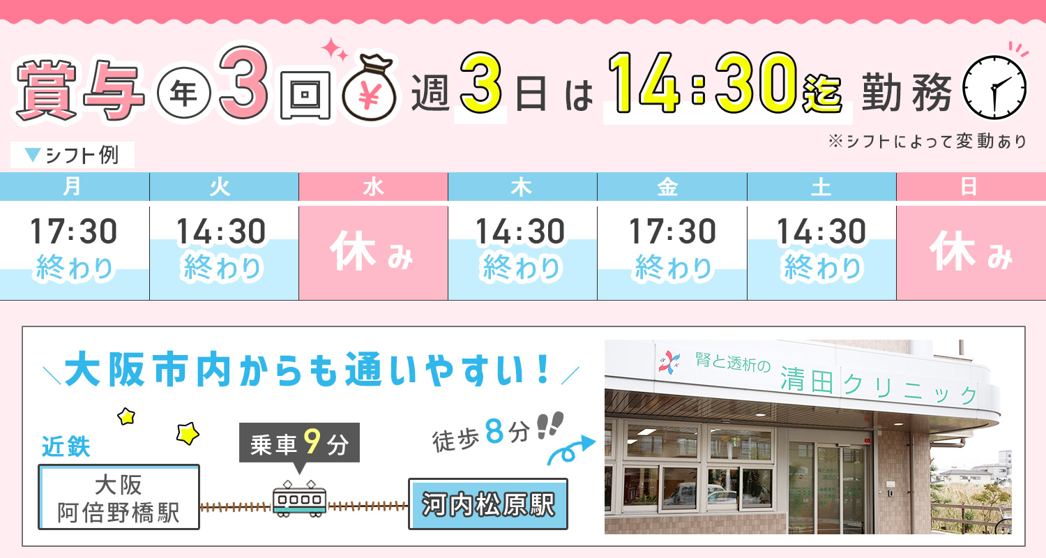| 待 遇 | #賞与あり 年3回 #昇給あり #社会保険完備 調整手当(最大2万円)支給あり 交通費支給 (実費/月2.5万円迄) #車通勤OK (ガソリン代支給) バイク通勤OK 自転車通勤OK 無料駐車場完備 退職金制度あり(勤続年数3年以上) 定年制(65歳迄)/再雇用制度あり(70歳迄) 資格取得支援制度(透析看護認定看護師など) |