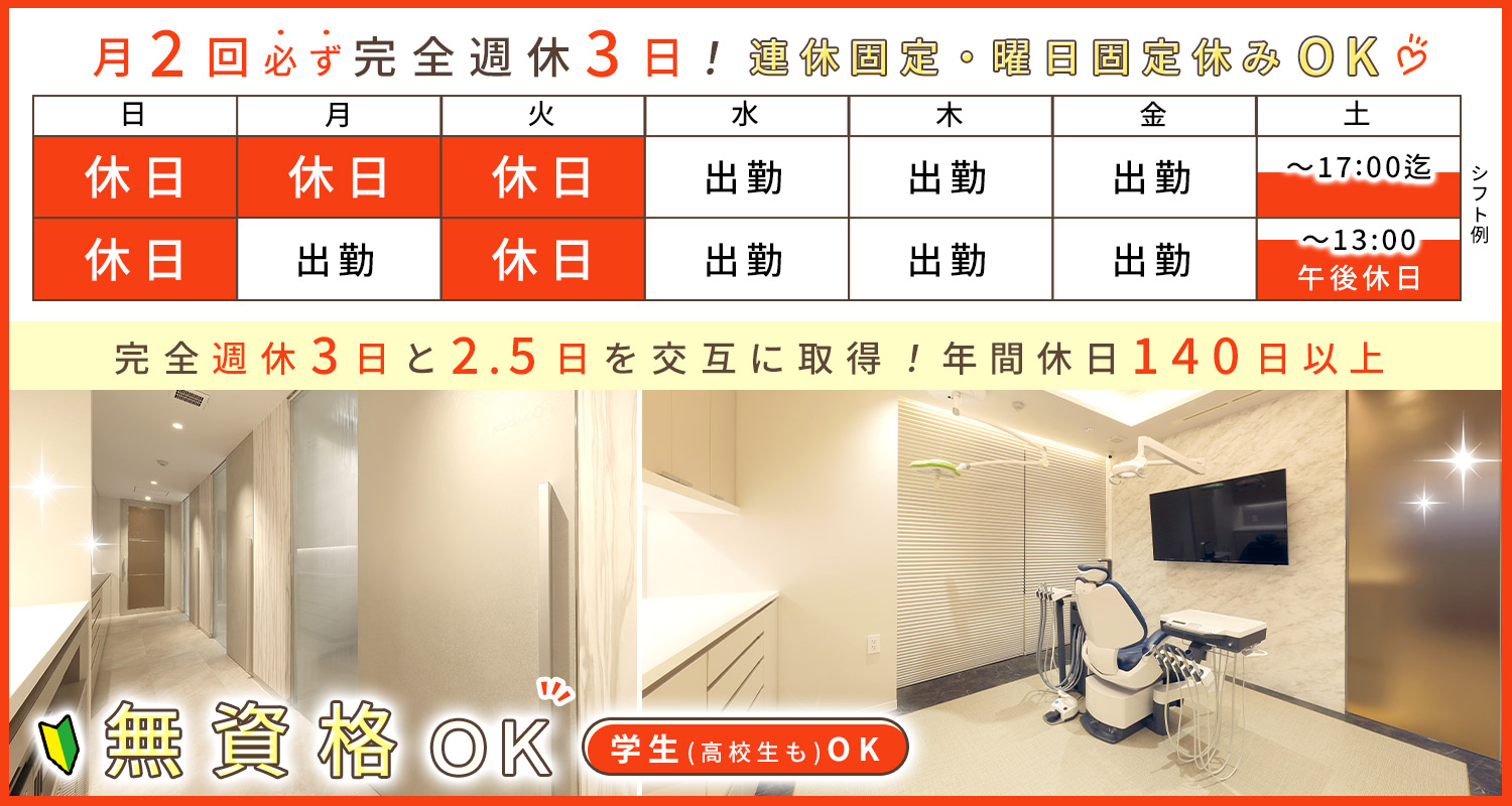 | 休日・休暇 | 週1日から勤務OK ※固定曜日勤務もOK #シフト制(時間・曜日の相談OK) <休診>火曜・祝日 <休暇>有給、GW、夏季、年末年始(各約7日) |
