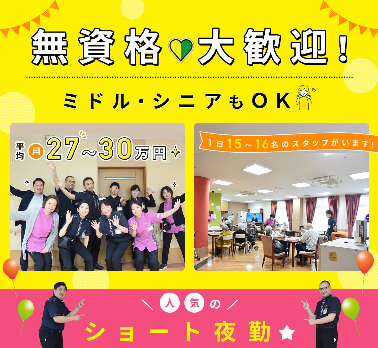 | 応募資格 | 介護福祉士の資格をお持ちの方 ※介護福祉士の他、実務者研修修了者など介護資格と経験がある方の正社員採用例あり #ブランクOK (ブランクの長い方もOK) ※学歴不問 ※年齢不問(シニアやミドルも歓迎) |