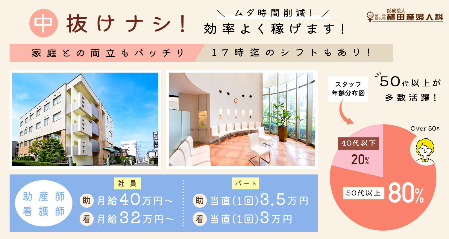 | 応募資格 | 助産師資格 □□□ ※年齢不問 ※かけもち・WワークOK(パート勤務の方) ※経験者歓迎 ※ミドル・シニア歓迎 |