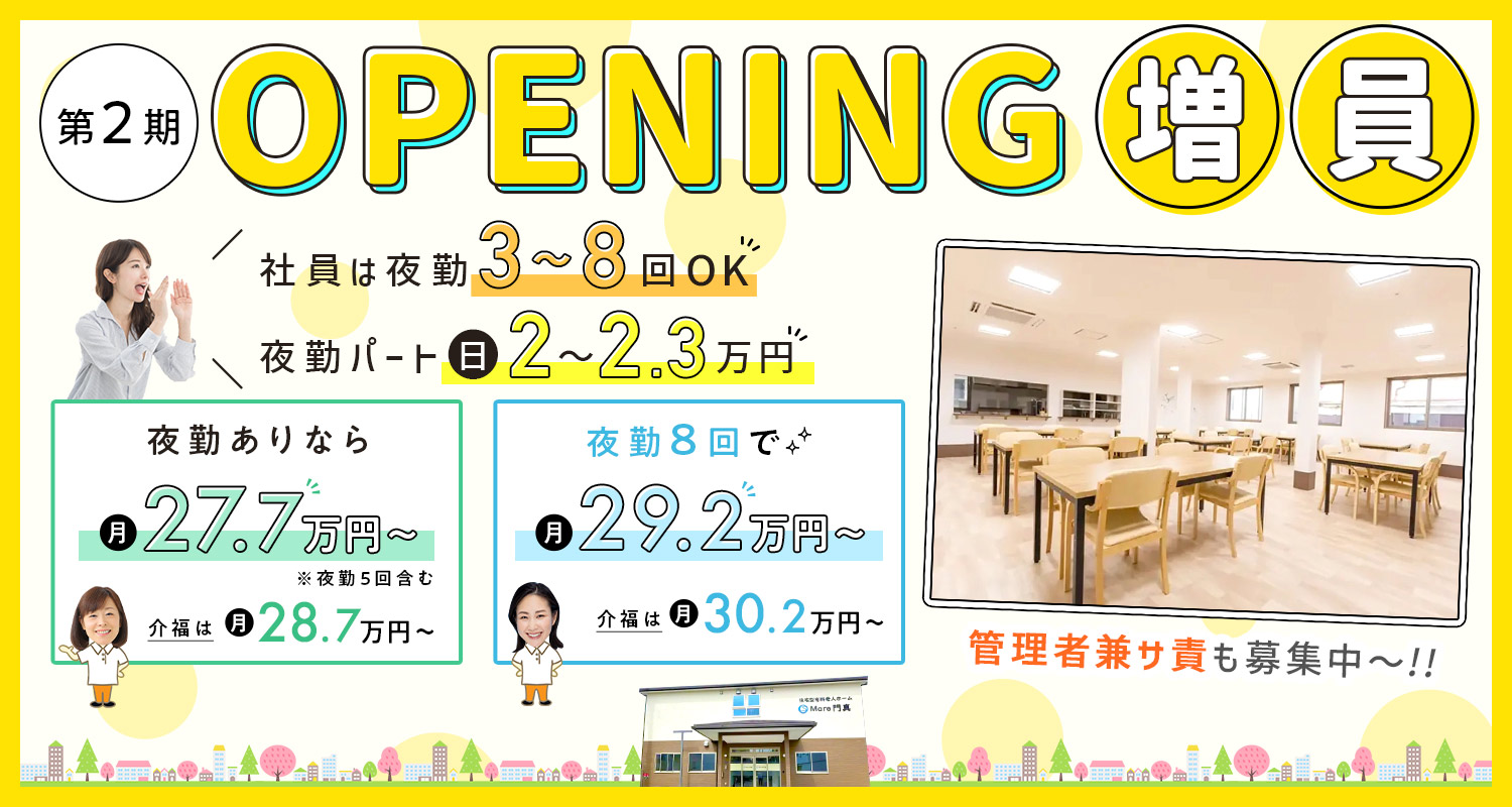 | 仕事内容 | 管理者兼サービス提供責任者/介護福祉士など[社] 2025年夏に完全新築OPEN! 定員49名の住宅型有料老人ホームにて、施設運営業務やスタッフのマネジメント、関係機関との連絡調整、訪問介護計画書等の作成、入居者様のアセスメント及びモニタリングなどをお願いします。 状況に応じて、入居者様へのケア(食事・口腔ケア・入浴・排泄など)もお願いします。 ※業務は一つひとつお任せしていくので、未経験の方もご安心ください。 ※管理者・サ責業務 約7割・現場業務 約3割 現場業務の割合は多すぎず、身体的・精神的に無理な勤務はありません! |