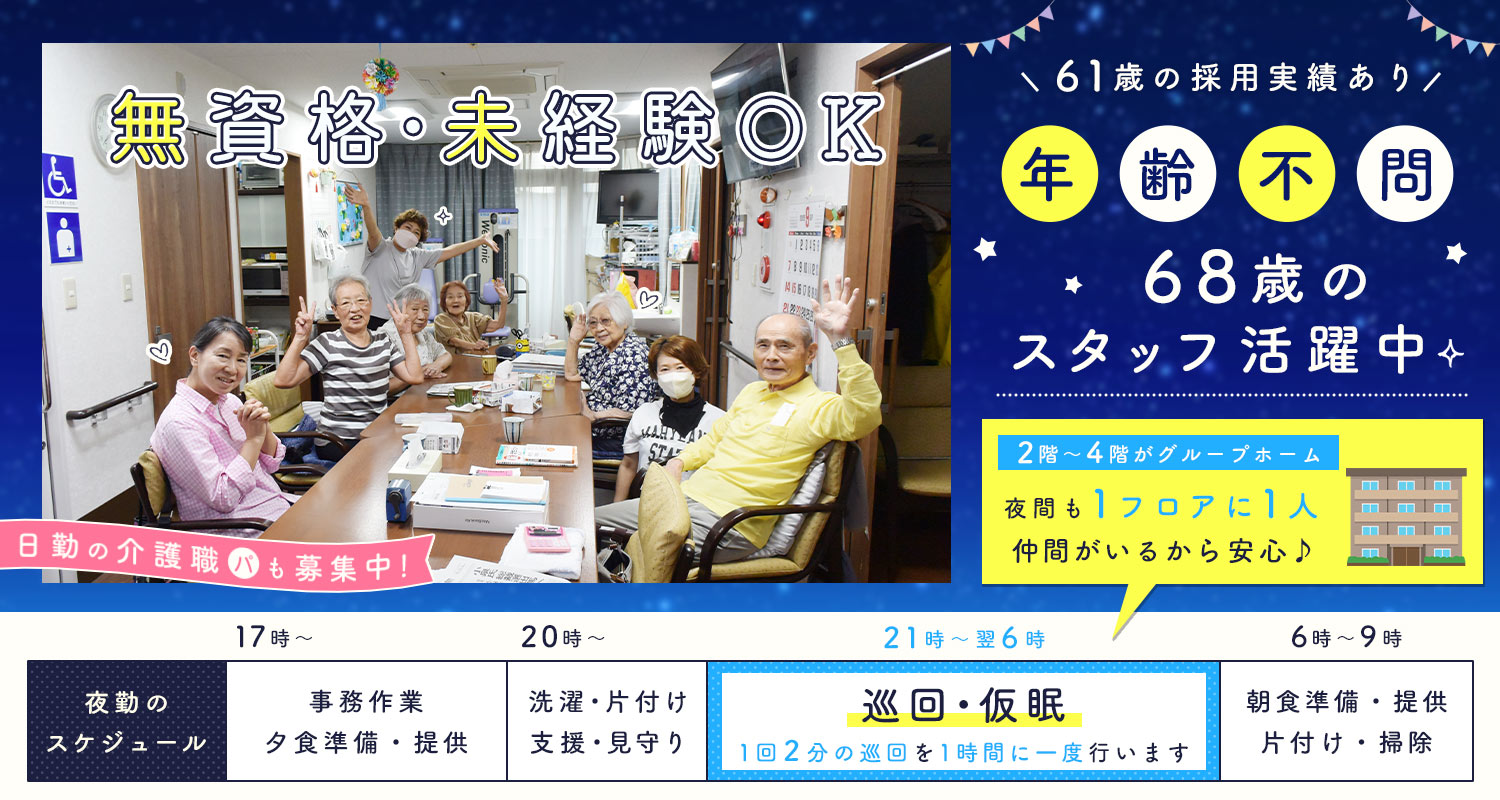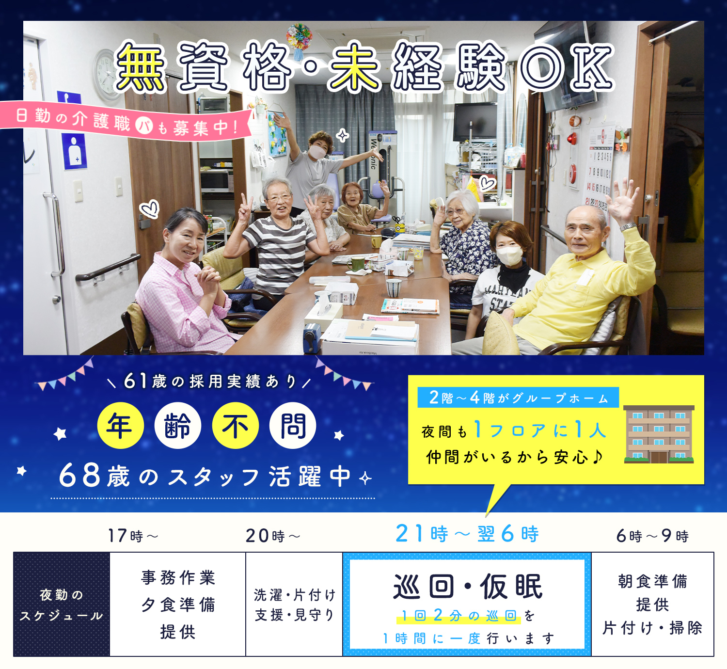 | 応募資格 | 無資格・未経験OK #ブランクOK ※無資格の方は、入社後に『認知症介護基礎研修』を受講していただきます。 #ブランクOK ※年齢不問!シニアやミドルも歓迎 ※学生OK ※Wワーク、かけもちバイトOK |