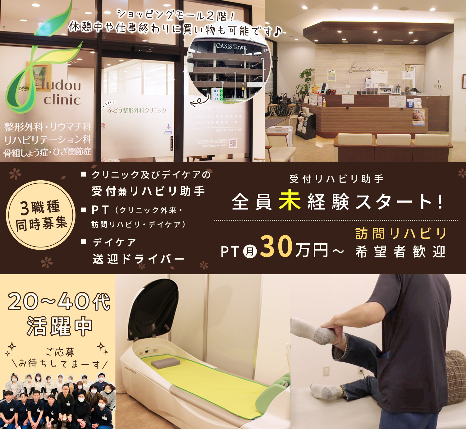 | 職 種 | (1)訪問リハビリ理学療法士(PT) (2)クリニック外来理学療法士(PT) (3)デイケア理学療法士(PT) |
