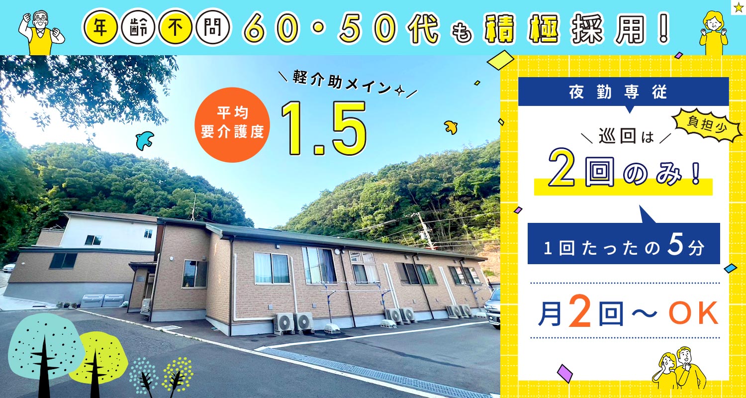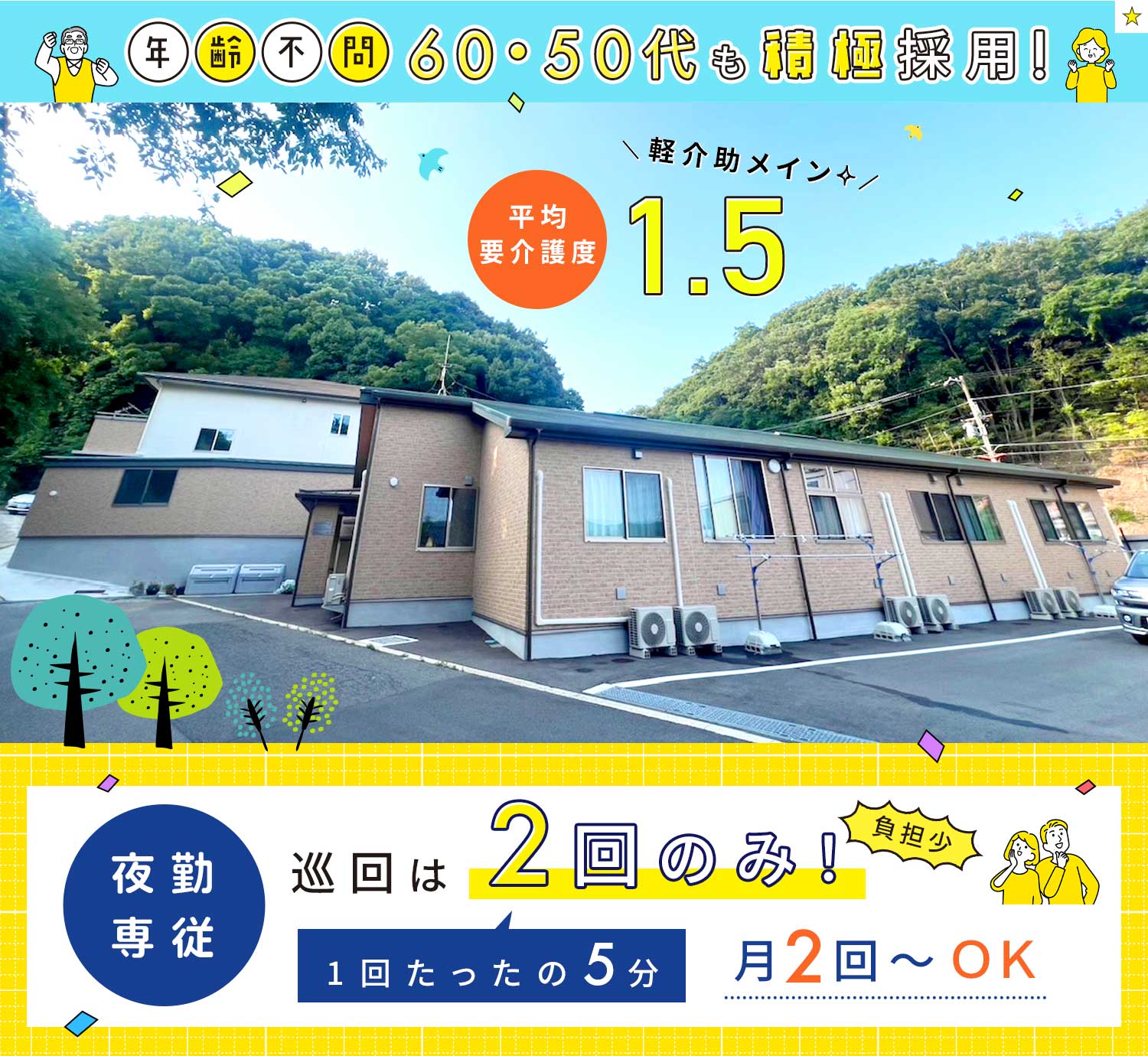 | 応募資格 | 介護職員初任者研修(旧ヘルパー2級)以上 ※認知症介護基礎研修修了者も可 #ブランクOK シニアやミドルも歓迎! ※22時~翌5時迄の勤務は18歳以上の方のみ □□□ #60代以上応募可 【応募者100%面接!】 「まだまだ元気なのに働き先が見つからない…」 「かけもち勤務で稼ぎたい!」、そんな方も大歓迎☆ 年齢不問!人柄重視採用! 現在20~70代まで元気に活躍しています◎ |